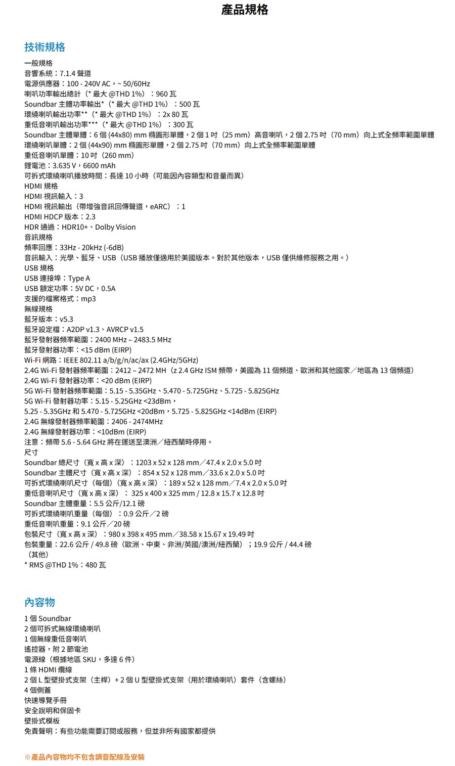 JBL BAR 1000MK2 7.1.4聲道家庭劇院 ~960 瓦最大輸出功率 ~10 吋無線重低音喇叭 ~支援夜間聆聽模式