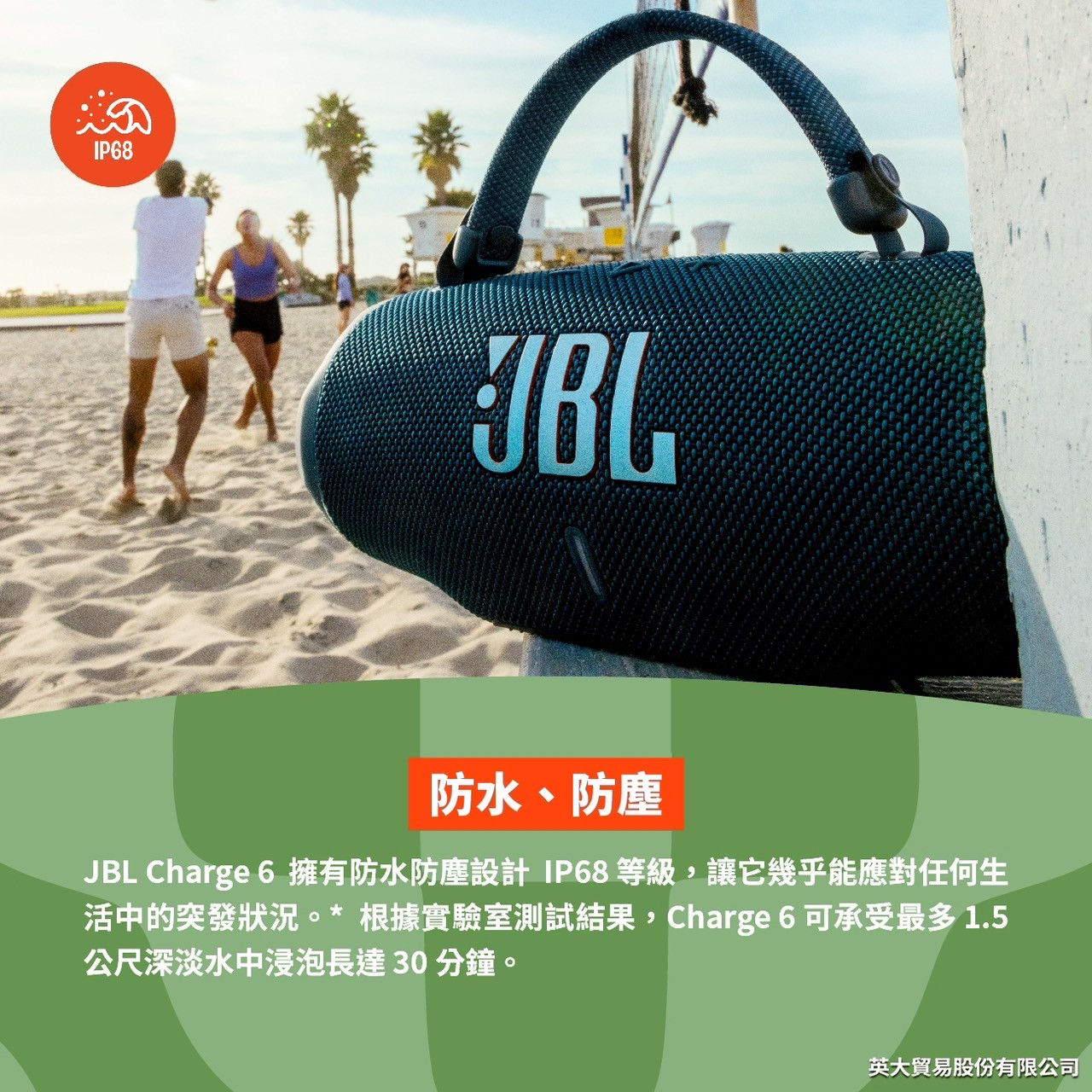 JBL Charge 6 可攜式防水藍牙喇叭 ~載 AI 音效強化技術 ~長達 28 小時播放時間 ~堅固好提的手提繩設計 ~IP68防水、防塵 ~快速充電