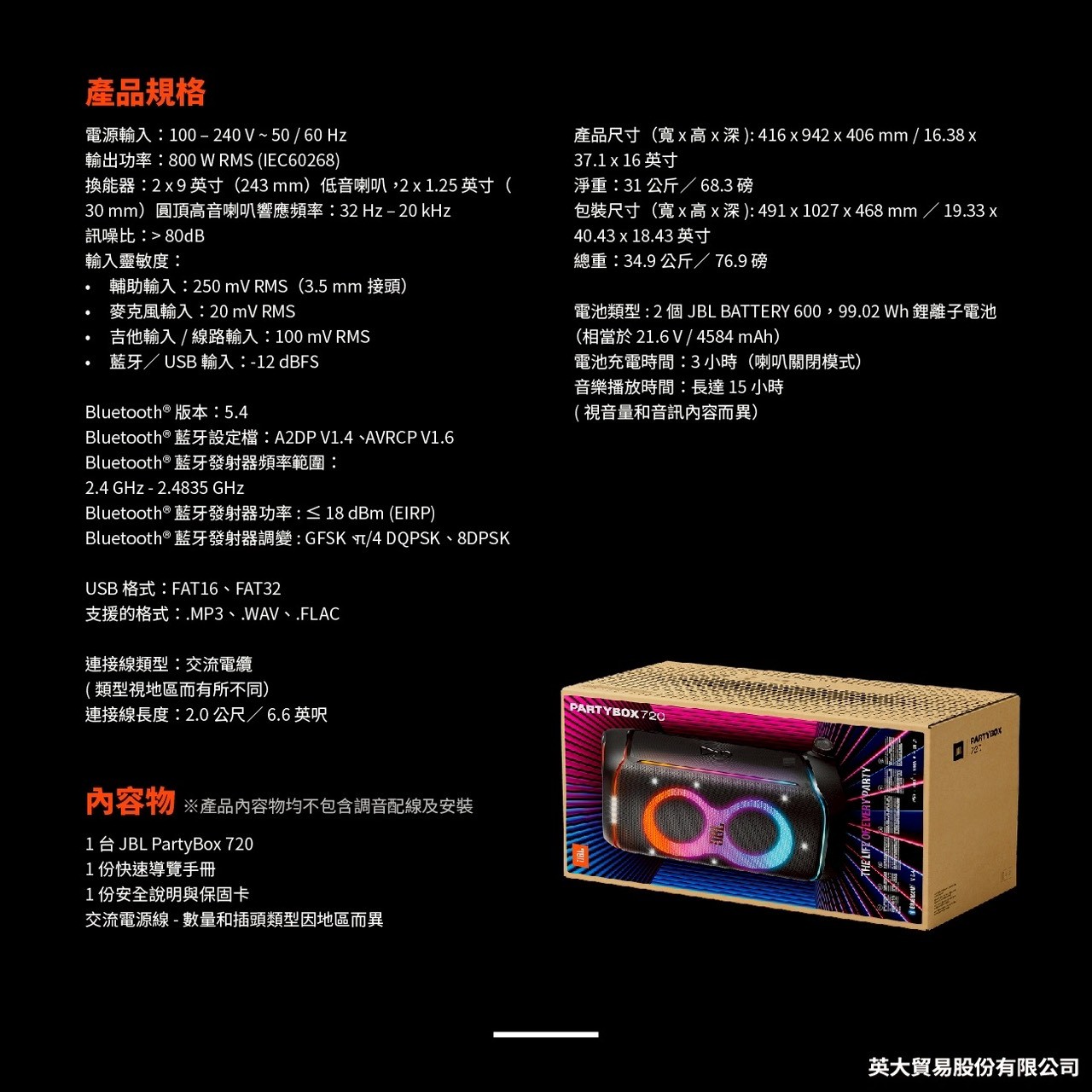 ◆ 電池類型: 2 個 JBL BATTERY 600,99.02 Wh