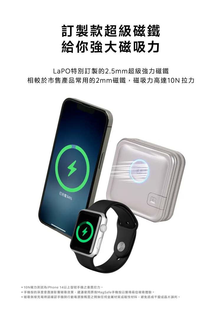・內建2合1無線充電線圈模組,配有10N強力磁環,磁吸功能更便利
