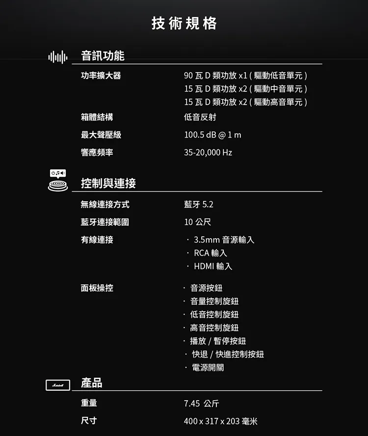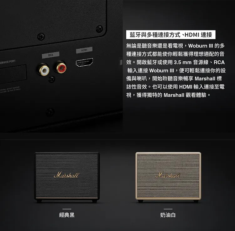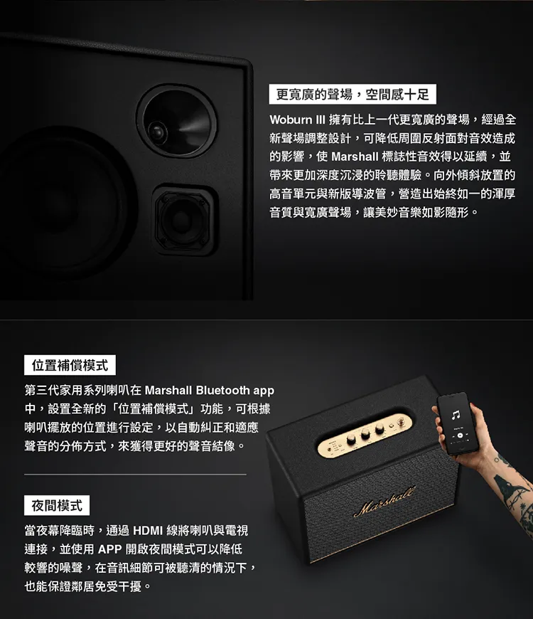 ~沉浸感與空間感十足的Marshall標誌性音質 ~三分頻系統帶來更強勁低頻的低音和更清晰的中音 ~通過HDMI線連接電視,開啟夜間模式可以降低較響的噪聲