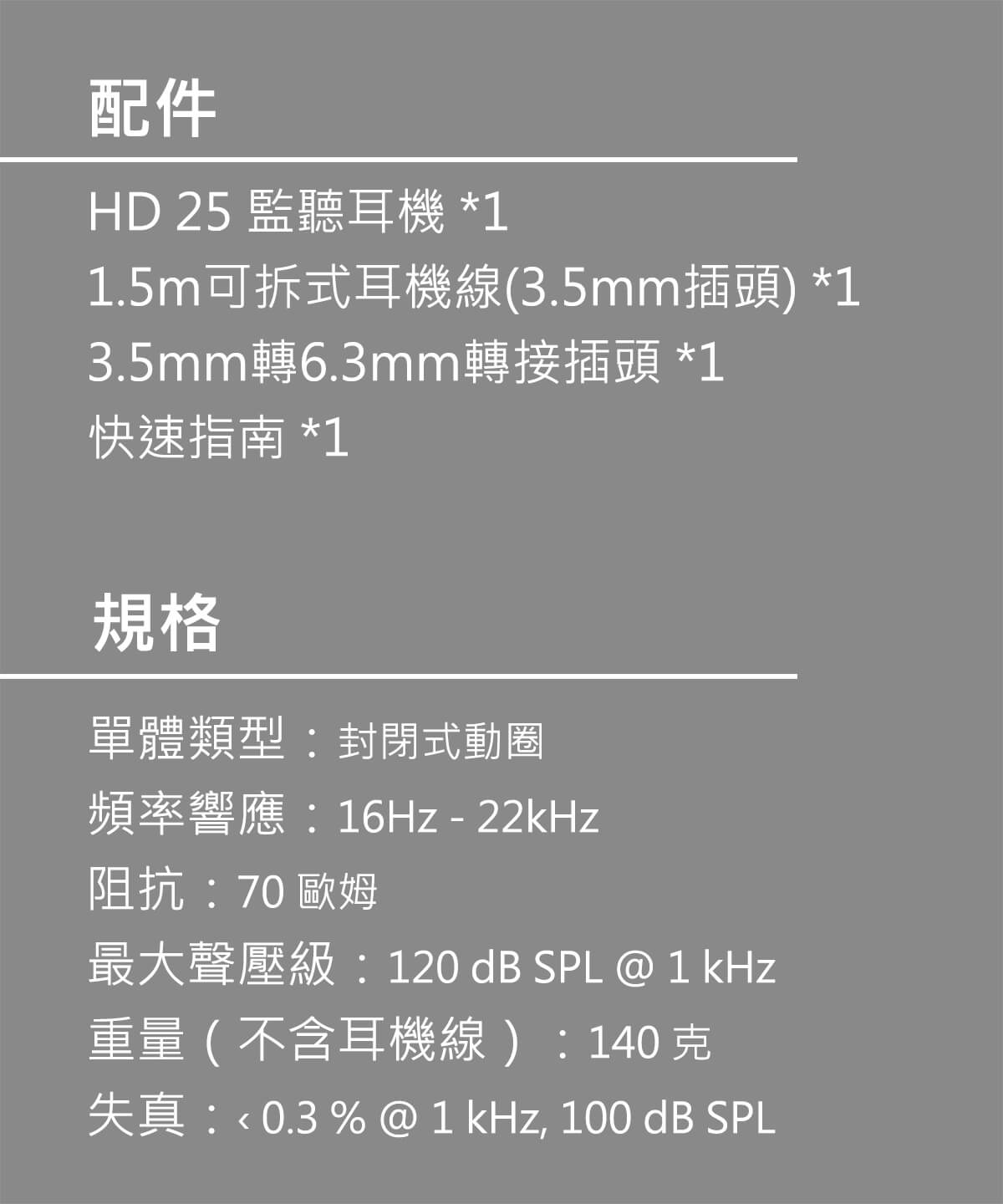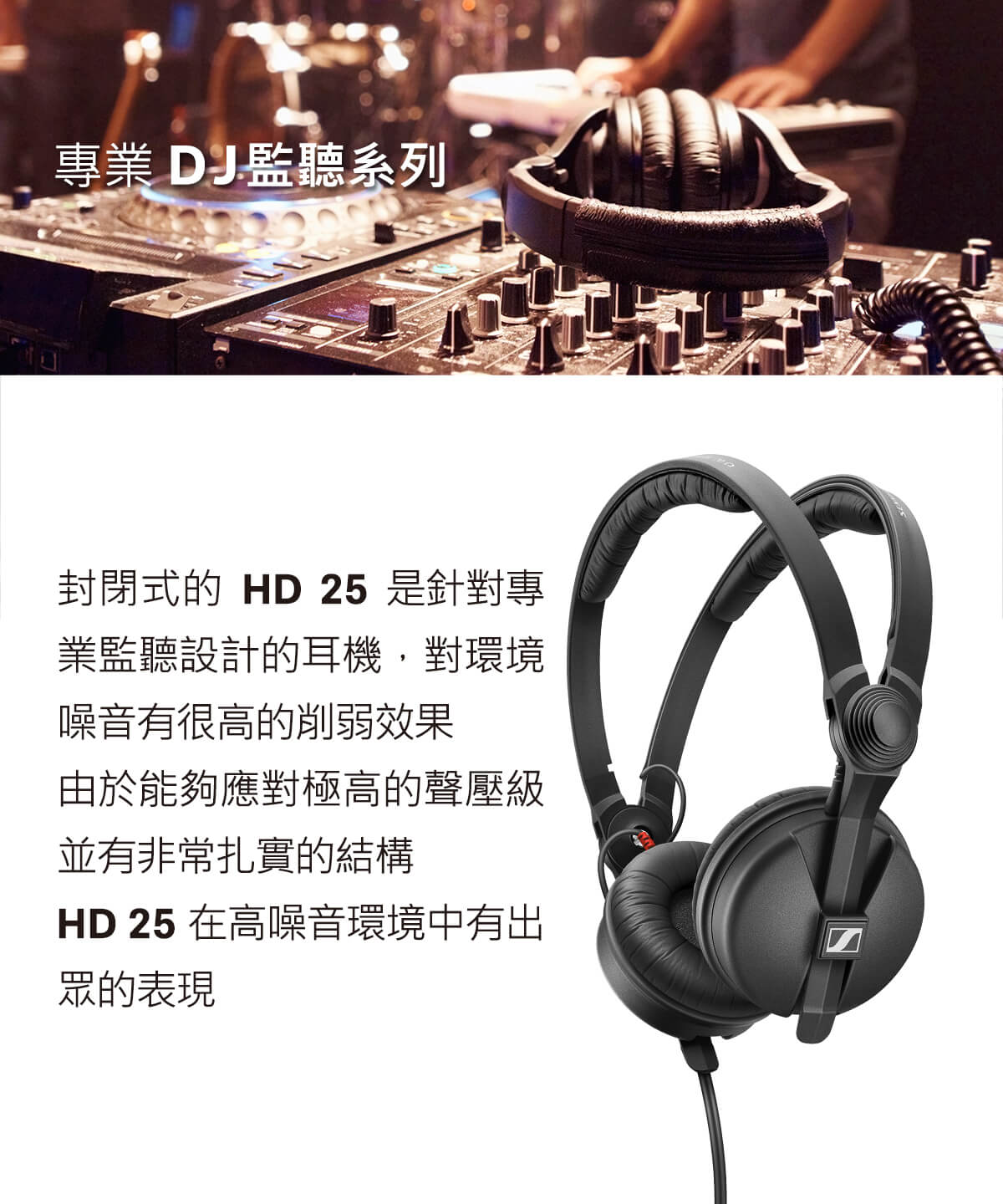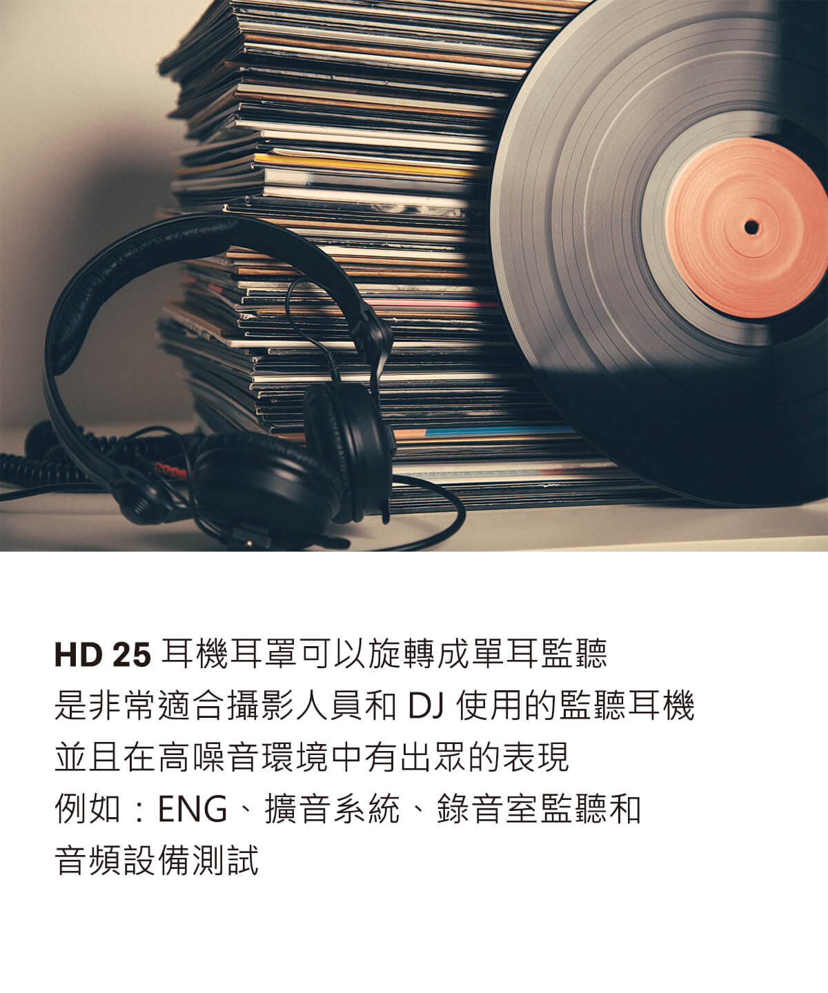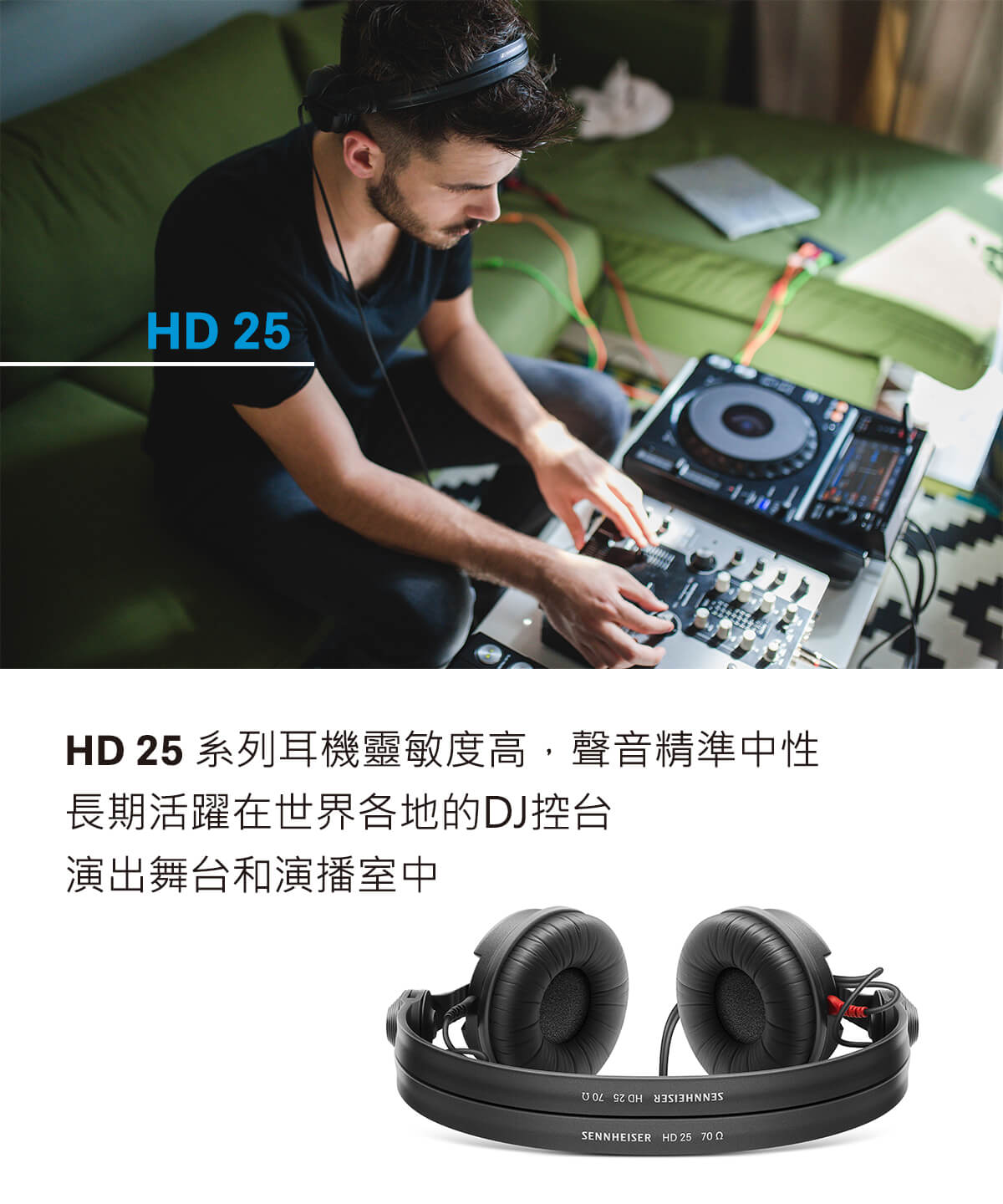 Sennheiser 25 經典款監聽耳機 ~HD 25 系列耳機靈敏度高,聲音精準中性,長期活躍在世界各地的 DJ 控台、演出舞台和演播室中。 ~有絕佳的隔音效果,用料扎實非常耐用,可單耳監聽使用,方便各種 DJ、錄音、攝影等監聽與收聽使用。 ~可旋轉式耳罩 用於單耳聆聽 受大動態的音樂類型且不失真 ~輕巧舒適包覆性高 堅固的可換線式單邊出線線材 ~可旋轉式耳罩 用於單耳聆聽