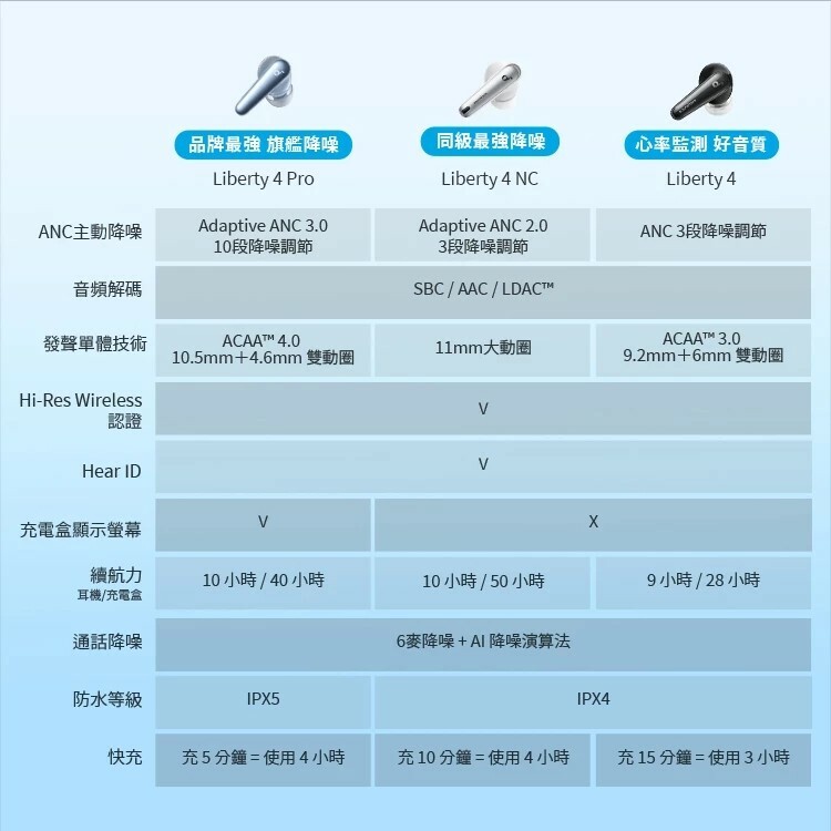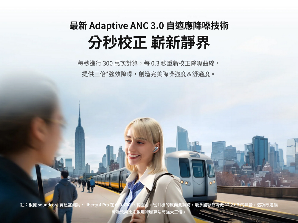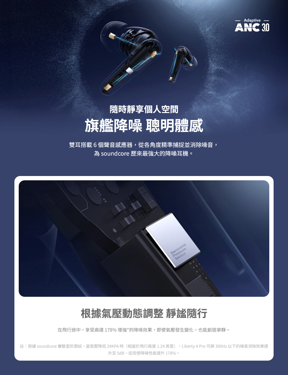 Soundcore Liberty 4 Pro 降噪真無線藍牙耳機 ~旗艦降噪 聰明體感,雙耳搭載 7 個感應器 ~搭載最新 Adaptive ANC 3.0 自適應降噪技術,每 0.3 秒重新校正降噪曲線