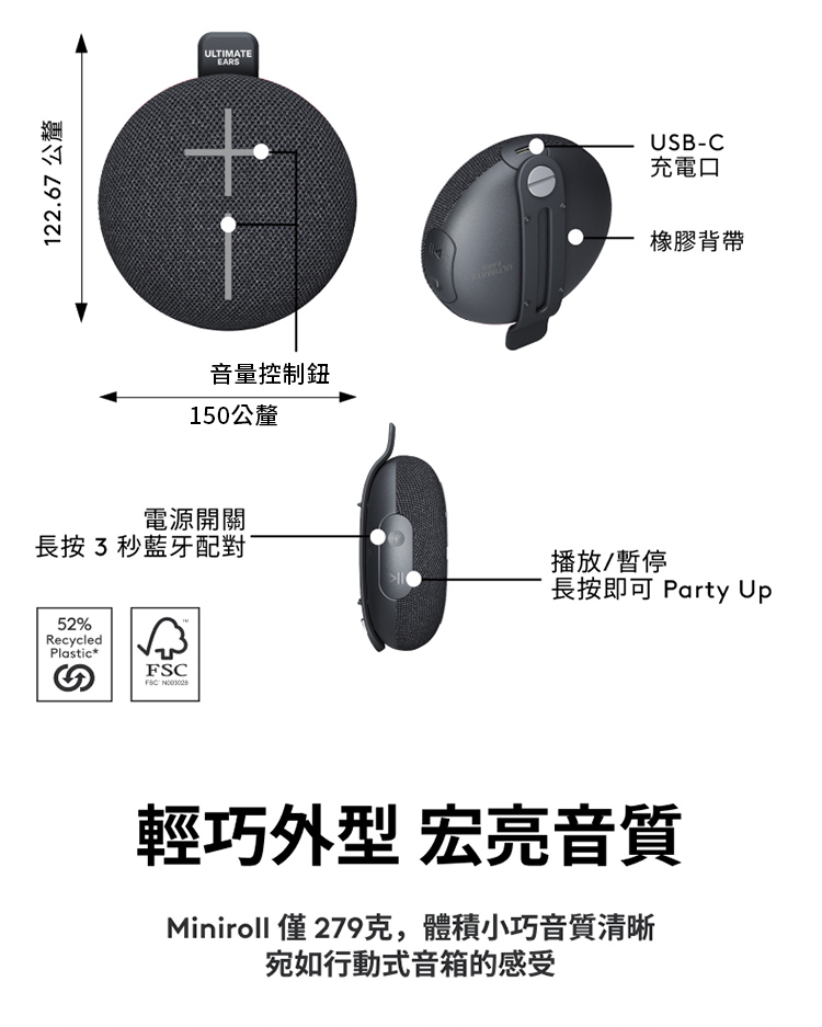 Ultimate Ears Miniroll 攜帶式藍牙喇叭 ~輕巧便攜 宏亮音質 ~IP67 防水防摔 ~橡膠掛勾設計 方便攜帶