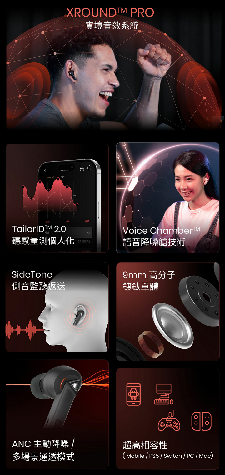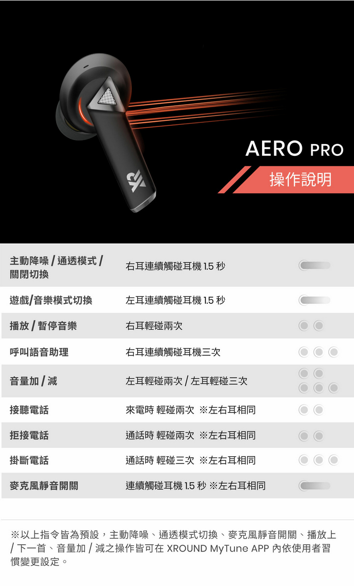 XROUND AERO PRO 低延遲降噪耳機 ~遊戲音效和歌曲音樂一樣 ~都是生活中重要的娛樂 ~我們希望打造一支耳機 ~能同時滿足這兩個需求。 ~極低延遲+可調環繞+鍍鈦音質 = AERO PRO 低延遲降噪耳機 ~最新藍牙5.3技術, Class 1 ~藍牙編碼支援 SBC、AAC、LC3 (Ready) ~9mm高分子鍍鈦動圈單體 ~ANC多段主動式降噪技術 ~4個抗風噪指向設計 MEMS 麥克風 ~IP55 防塵防水係數 ~搭配充電盒最高36小時續航力 ~保固 一年半