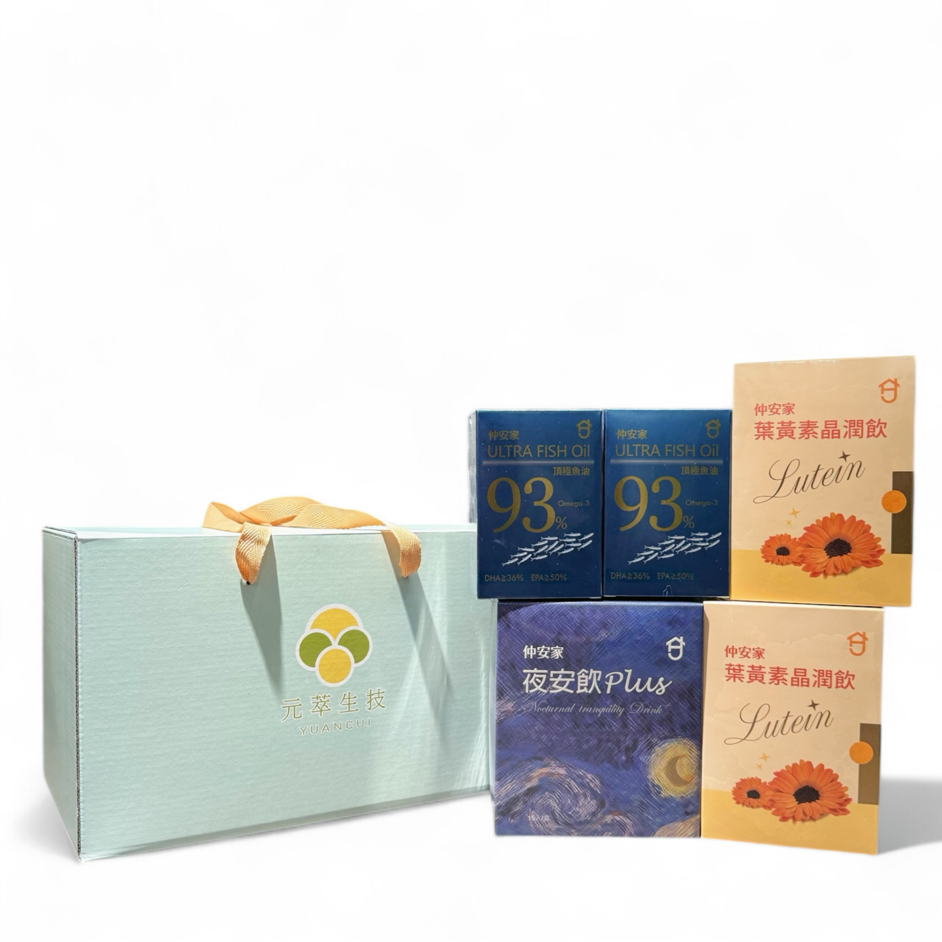 內容物: 仲安家 夜安飲Plus*1 仲安家 葉黃素晶潤飲*2 仲安家 ULTRA FISH OIL 頂極魚油*2