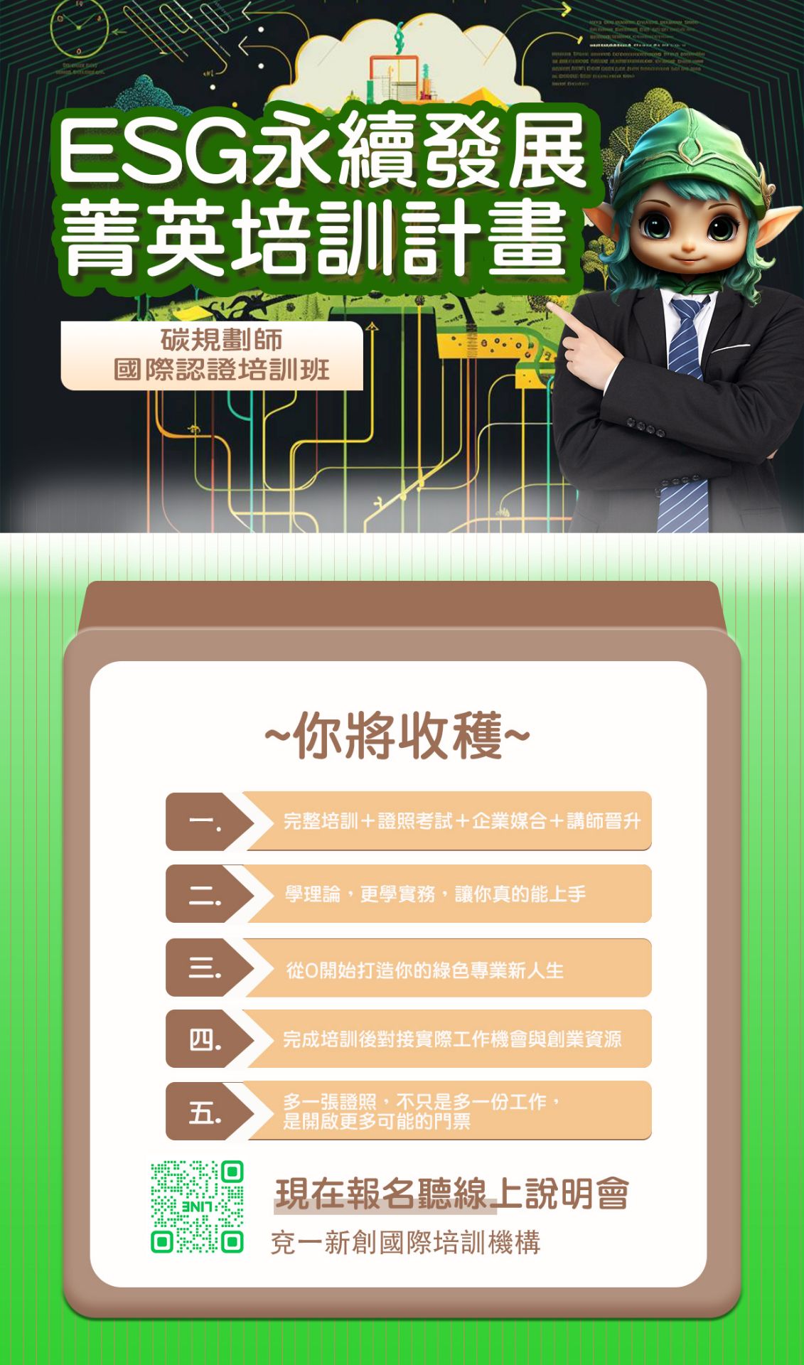 🌱 ESG永續發展菁英培訓計畫 × 碳規劃師證照認證班 抓住時代浪潮,成為企業最搶手的永續關鍵人才! ✅ 專業培訓 × 實戰應用 × 證照加持 ✅ 通過認證,即刻對接就業 & 講師機會 機會只留給有準備的人——現在報名,成為永續轉型的領航者! 👉 立即報名,卡位未來!