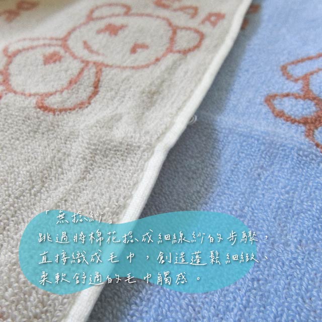 【商品特色】 >觸感蓬鬆,柔軟輕膚。 >花色可愛,小朋友都喜愛。 >天然棉花織造,舒適耐用。 「無撚紗與一般棉紗的差異」 天然棉花的纖維長度不似人造纖維那麼平均、整齊, 紡紗過程中會經由『精梳』的過程, 保留長纖維並去除短纖維,以得到高品質的棉紗。 因為棉紗沒有經過捻紗的工序, 故在棉紗中加入特殊水溶性纖維加強紗線的強度, 織成毛巾後再進行「解捻」工序, 將水溶性纖維完全剔除, 使毛巾的觸感更加蓬鬆、軟柔。