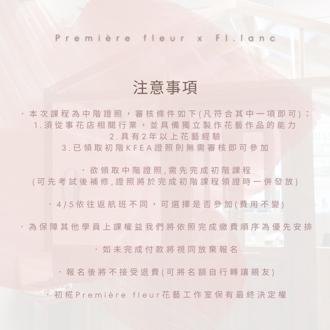 大家期待已久的韓國遊學班上線囉! 四人成團,前往韓國進行為期4日的深度學習,包括3日集訓與1日韓國花市巡禮。 • 除學習外,更能體驗韓國的文化與當地花卉市場的多樣性。 • 使用韓國獨特花材,體驗更具挑戰性與創造力的設計課程,並拓展視野。 • 可參加整期課程或單日課程,滿足不同需求與時間安排! • 世界上獨一無二的特別樹脂工藝藝術是韓國的新銷售項目,對花卉店的創業和運營會有很大的幫助。 • 本次課程為中階證照,審核條件如下(凡符合其中一項即可): 1.須從事花店相關行業,並具備獨立製作花藝作品的能力。 2.具有2年以上花藝經驗 。 3.已取得KFEA初階花藝師證照者,則不受以上限制 。 • 欲領取中階證照,需先完成初階課程(可先考試後補修,證照將於完成初階課程領證時一併發放)。 Fl.lanc florist academy韓國花藝學院是由2位 前VeryView韓國花藝學院主力講師創立的花藝學院, Fl.lanc florist academy院長更創立了KFEA韓國花卉教育協會(具有韓國職業能力研究院許可認證),致力於推廣花藝教育及培養花藝人材。很榮幸, 初椛Première fleur花藝工作室是台灣唯一KFEA韓國花藝證照的考取教室。 收穫最新韓式花藝, 滿滿技巧理論與經驗, 絕對是您的最加選擇。😊