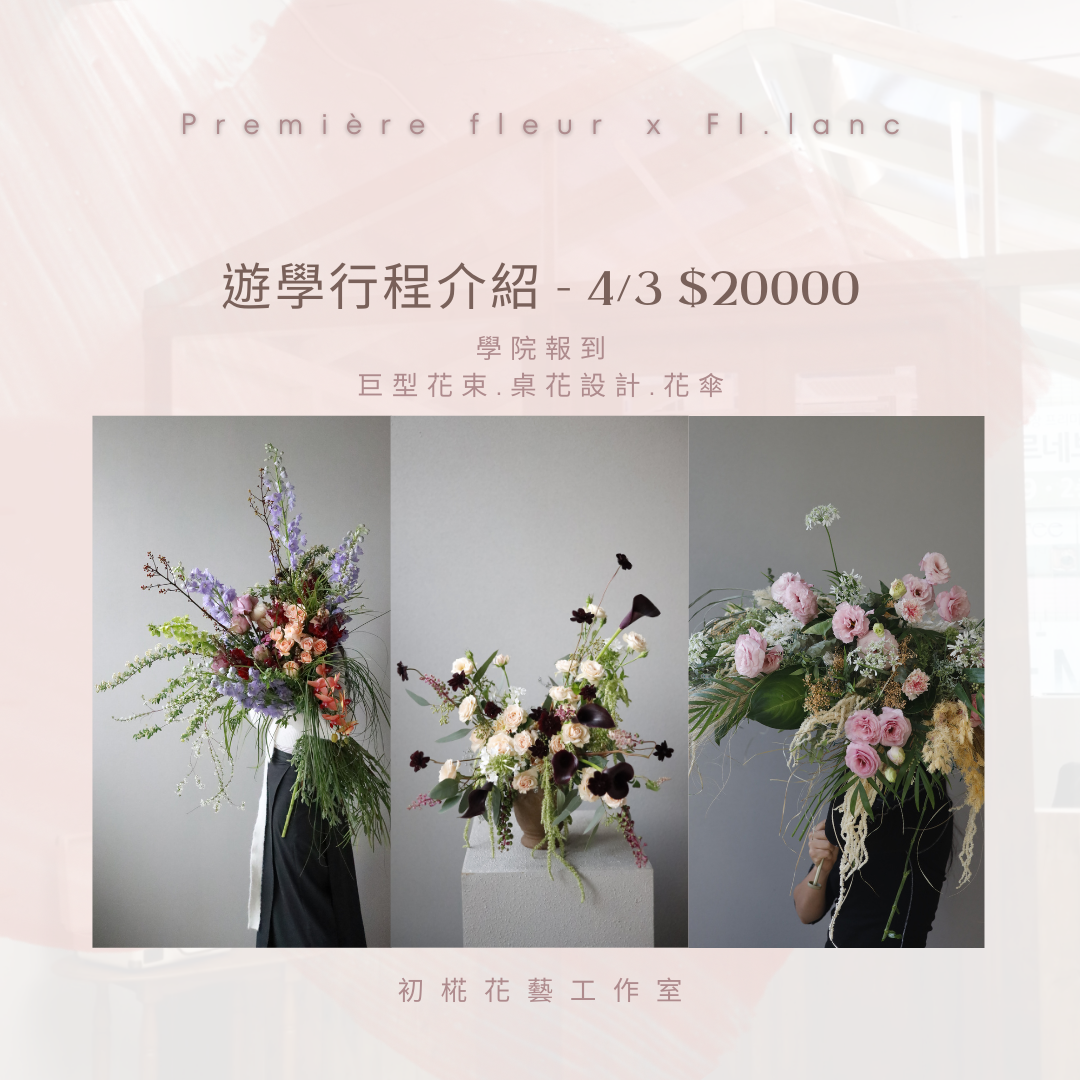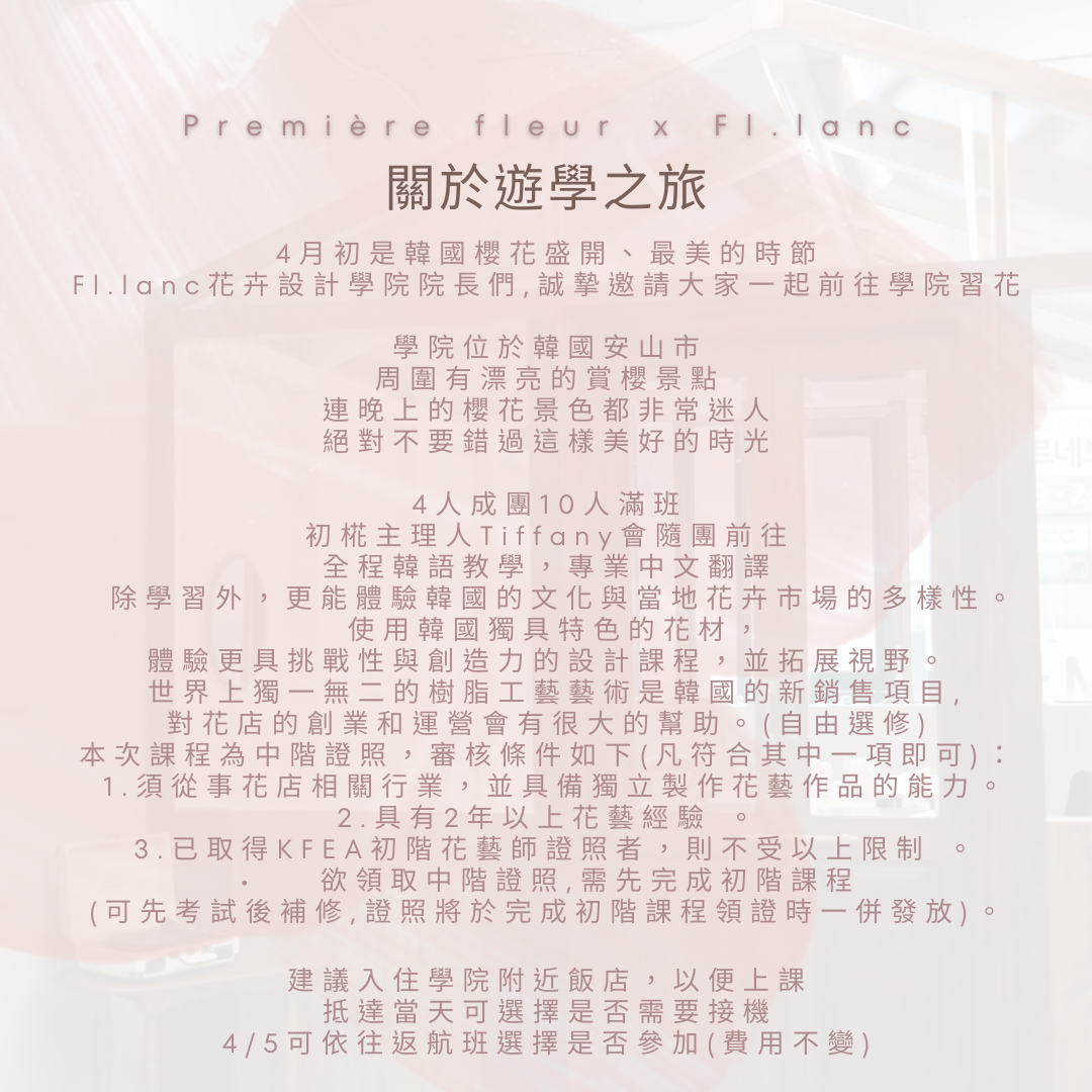 大家期待已久的韓國遊學班上線囉! 四人成團,前往韓國進行為期4日的深度學習,包括3日集訓與1日韓國花市巡禮。 • 除學習外,更能體驗韓國的文化與當地花卉市場的多樣性。 • 使用韓國獨特花材,體驗更具挑戰性與創造力的設計課程,並拓展視野。 • 可參加整期課程或單日課程,滿足不同需求與時間安排! • 世界上獨一無二的特別樹脂工藝藝術是韓國的新銷售項目,對花卉店的創業和運營會有很大的幫助。 • 本次課程為中階證照,審核條件如下(凡符合其中一項即可): 1.須從事花店相關行業,並具備獨立製作花藝作品的能力。 2.具有2年以上花藝經驗 。 3.已取得KFEA初階花藝師證照者,則不受以上限制 。 • 欲領取中階證照,需先完成初階課程(可先考試後補修,證照將於完成初階課程領證時一併發放)。 Fl.lanc florist academy韓國花藝學院是由2位 前VeryView韓國花藝學院主力講師創立的花藝學院, Fl.lanc florist academy院長更創立了KFEA韓國花卉教育協會(具有韓國職業能力研究院許可認證),致力於推廣花藝教育及培養花藝人材。很榮幸, 初椛Première fleur花藝工作室是台灣唯一KFEA韓國花藝證照的考取教室。 收穫最新韓式花藝, 滿滿技巧理論與經驗, 絕對是您的最加選擇。😊