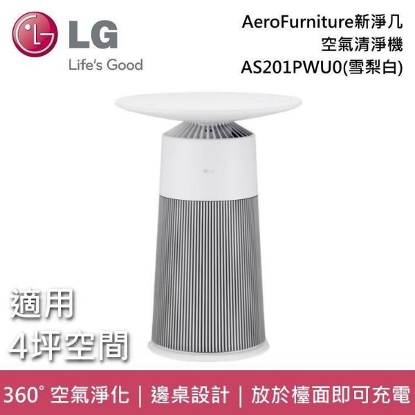 ★獲2023iF設計獎、紅點設計獎、CES創新獎 ★邊桌設計 + 空氣清淨機 ★360˚ 空氣淨化:360˚ HEPA 濾網,UVnano™ 技術 ★去除99.9%空氣中的細菌和小至0.01微米的超細灰塵 ★放置桌面即可無線充電 ★多彩氣氛燈,隨心轉換 ★ThinQ APP智慧操控 ★在睡眠模式下以最安靜的21dB運轉 ★使用 AeroFurniture 的柔和風速淨化 ★具有耐熱性,可承受高達114℃的溫度 商品規格 ★型號:AS201PWU0 ★顏色:雪梨白 ★功率輸入:28W ★電源供應器:110V/60Hz ★能源等級:2 ★風扇馬達類型:BLDC馬達 ★風扇模式/淨化級數:5段風速(自動/低/中/高/睡眠) ★CASR(CMM):2.57 ★噪音(高/低,dB):44/21 ★感應器:粉塵(PM1.0) ★智慧指示器(空氣品質):4段(非常差→好)紅色/橙色/黃色/綠色 ★過濾等級:H13 ★空氣淨化器濾網:Aero SeriesV濾網x1EA,超細濾網(可替換)x1個 ★能源效率值CASR/W(Dust):0.160 ★適用坪數:4 ★產品尺寸:寬410x高550x深410(mm) ★包裝尺寸:寬482x高585x長462(mm) ★產品重量:7.1kg ★運輸重量:9.0kg ★產地:韓國 ★保固:2年 ★NCC認證:CCAO21Y10260T8 ★BSMI認證:R3A062