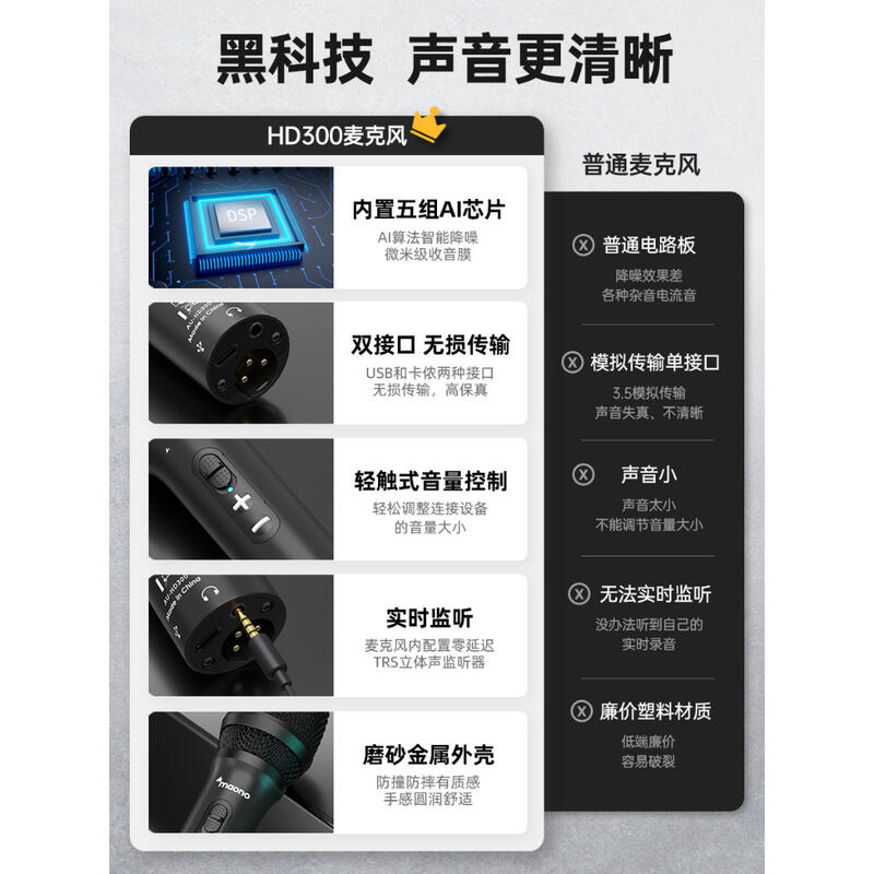 ‧專業音質和設計:HD300採用心形指向性極性模式,能夠有效抑制背景噪音,專注於主要聲源,這使其在各種錄音環境下都能提供清晰和準確的錄音。