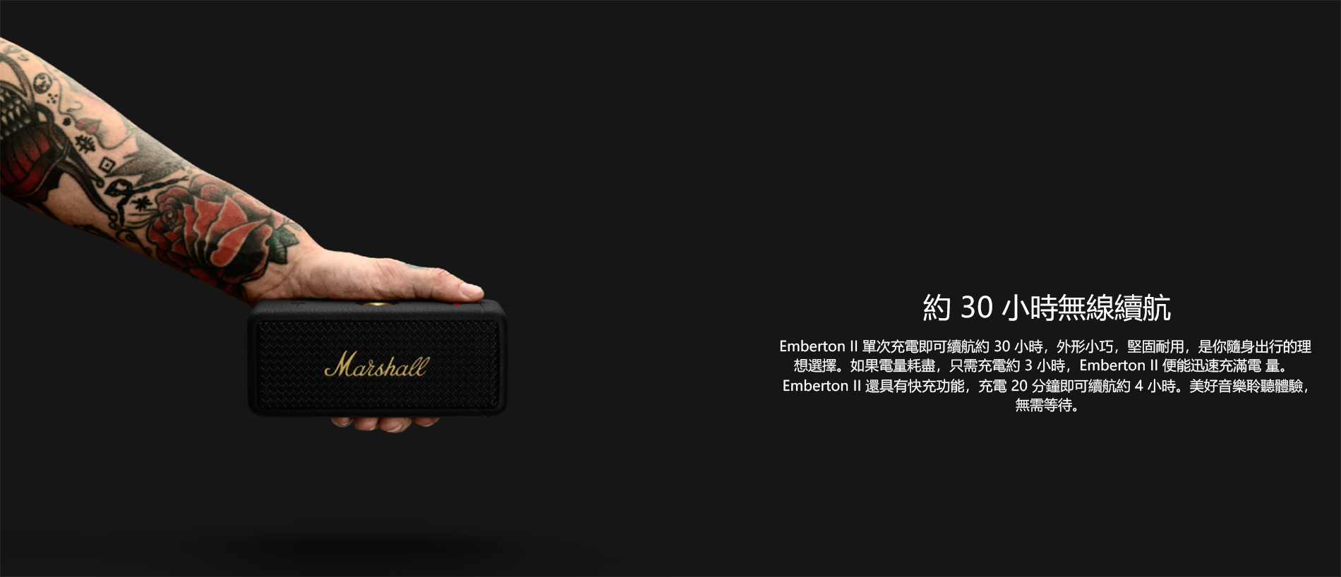 Emberton II 單次充電即可續航約 30 小時,外形小巧,堅固耐用,是你隨身出行的理想選擇。如果電量耗盡,只需充電約 3 小時,Emberton II 便能迅速充滿電 量。Emberton II 還具有快充功能,充電 20 分鐘即可續航約 4 小時。美好音樂聆聽體驗,無需等待。
