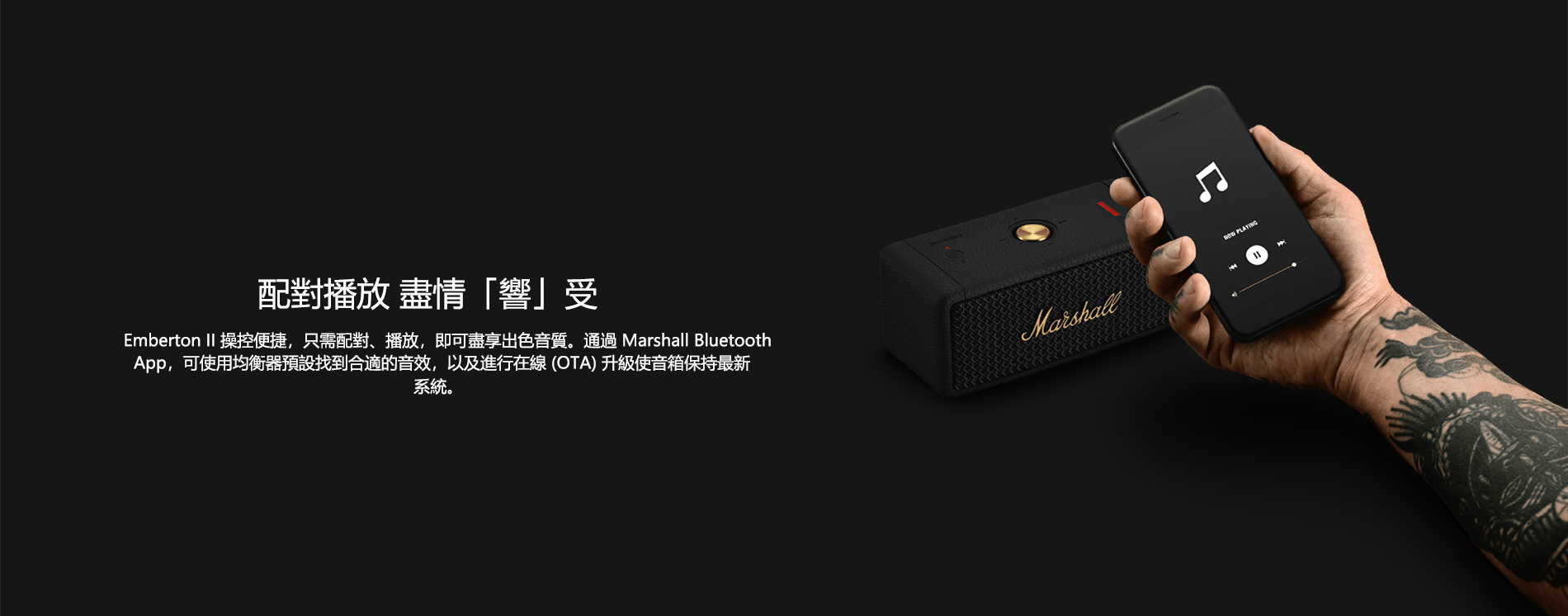 Emberton II 操控便捷,只需配對、播放,即可盡享出色音質。通過 Marshall Bluetooth App,可使用均衡器預設找到合適的音效,以及進行在線 (OTA) 升級使音箱保持最新系統。