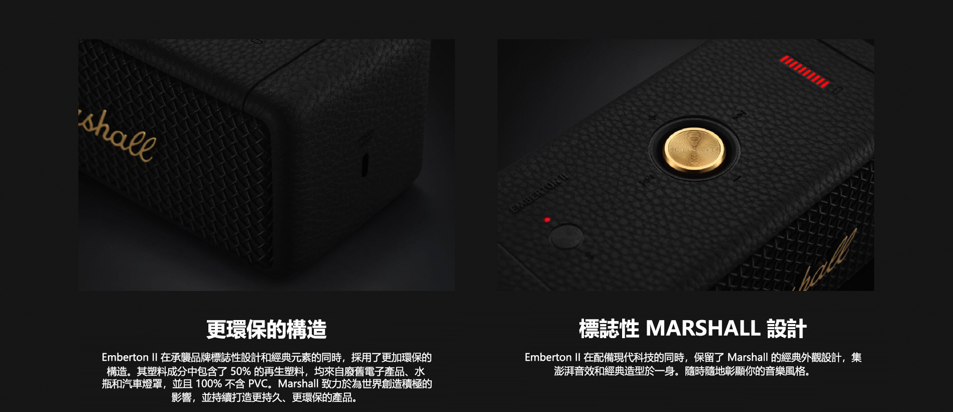Emberton II 在承襲品牌標誌性設計和經典元素的同時,採用了更加環保的構造。其塑料成分中包含了 50% 的再生塑料,均來自廢舊電子產品、水瓶和汽車燈罩,並且 100% 不含 PVC。Marshall 致力於為世界創造積極的影響,並持續打造更持久、更環保的產品。