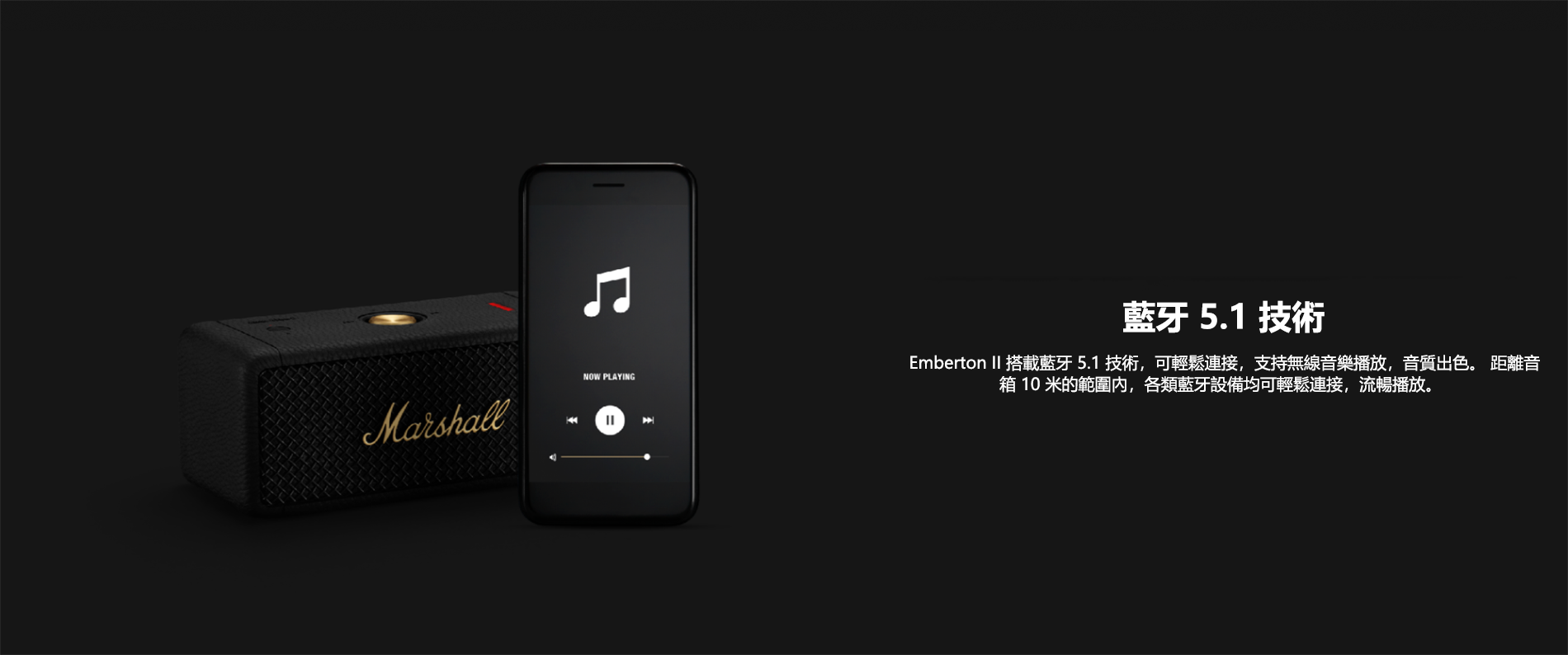 Emberton II 搭載藍牙 5.1 技術,可輕鬆連接,支持無線音樂播放,音質出色。 距離音箱 10 米的範圍內,各類藍牙設備均可輕鬆連接,流暢播放。