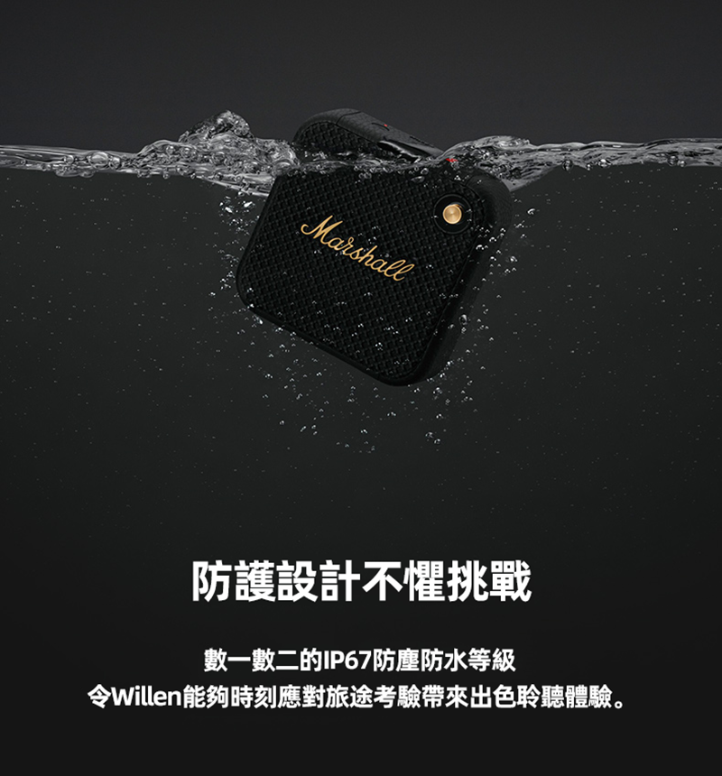 音箱內置一個2英寸全頻驅動單元和兩個無源輻射器,為你帶來 Marshall 的渾厚音質。數一數二的IP67防塵防水等級令這款音箱能夠時刻應對旅途考驗。