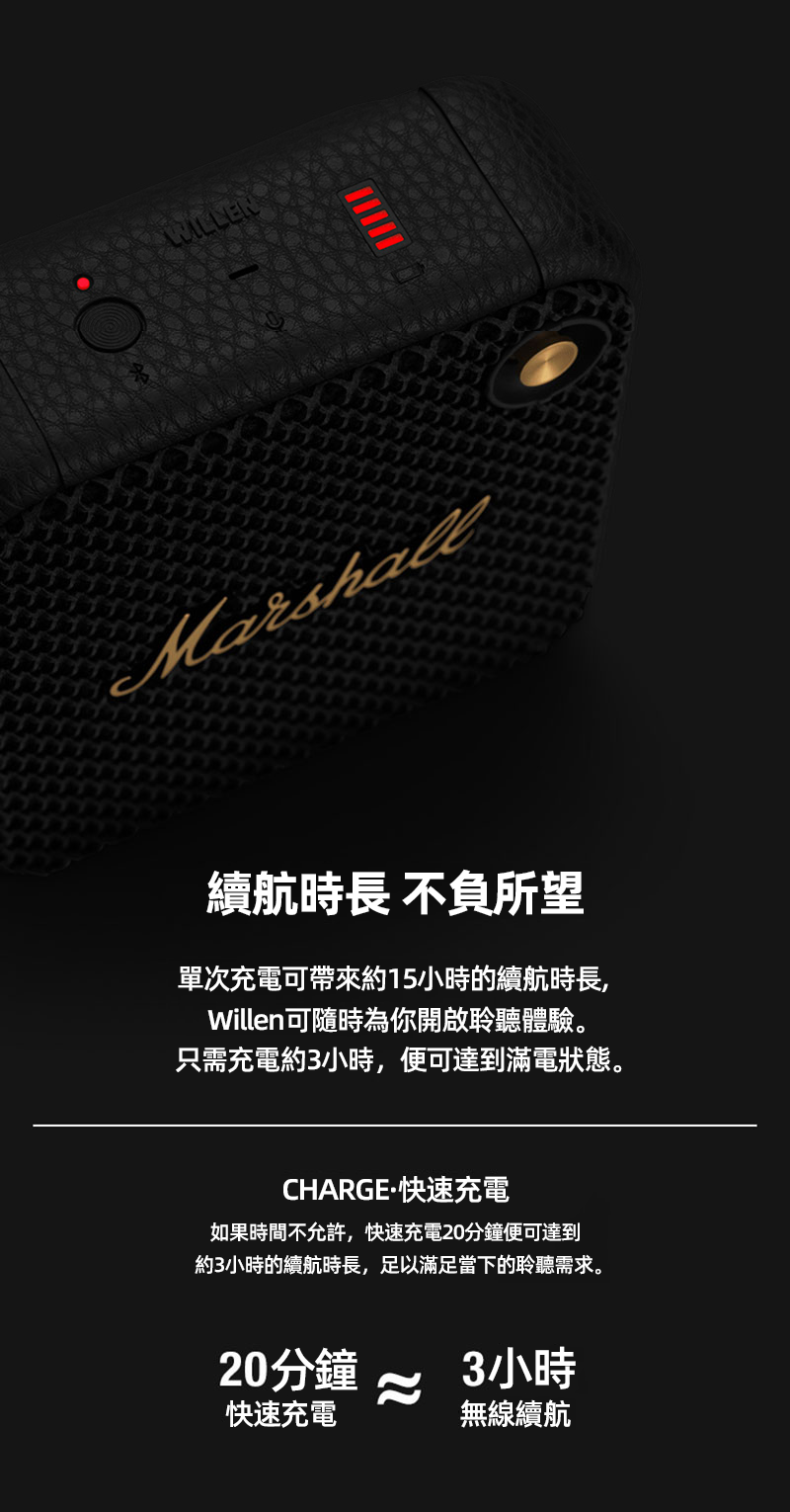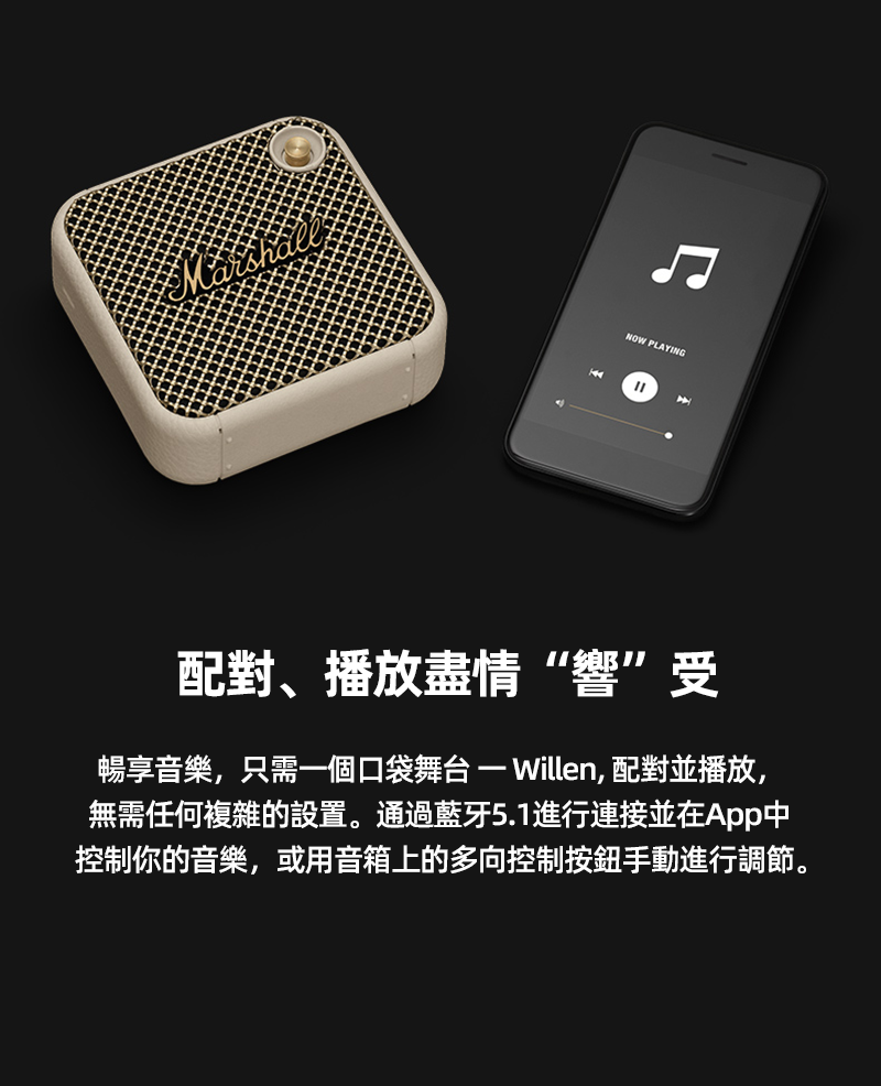 MARSHALL音質一路隨行:Willen是-款功能強大的便攜音箱,便於隨時輕裝上路。