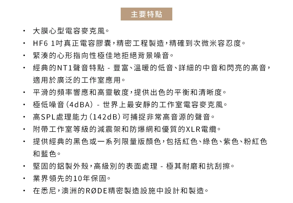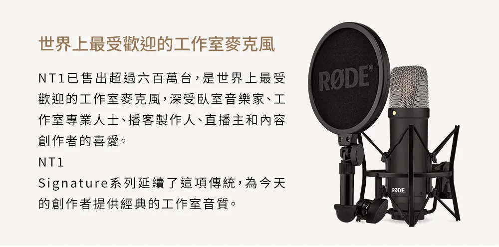 它提供了細膩的中頻回應,加上絲滑的高頻段和溫暖圓潤的低音,使 NT1 在同類產品中成為絕對的佼佼者。