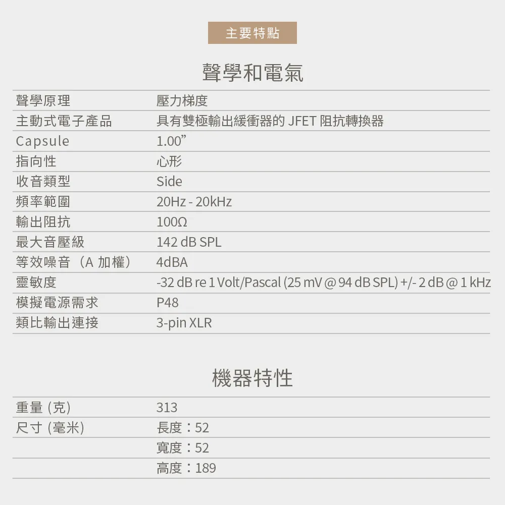 • Sensitivity(靈敏度):-29.0dB re 1 Volt/Pascal(94dB SPL 時為 35.00mV,1kHz 時 +/- 2 dB)