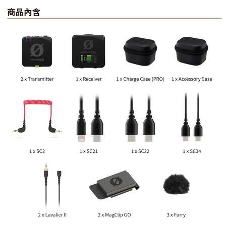 完整的配件套裝,包括可傳輸數據的智能充電盒、兩個Lavalier II專業廣播級領夾麥克風、手機相機適配轉接線、MagClip GO磁吸夾和配件盒