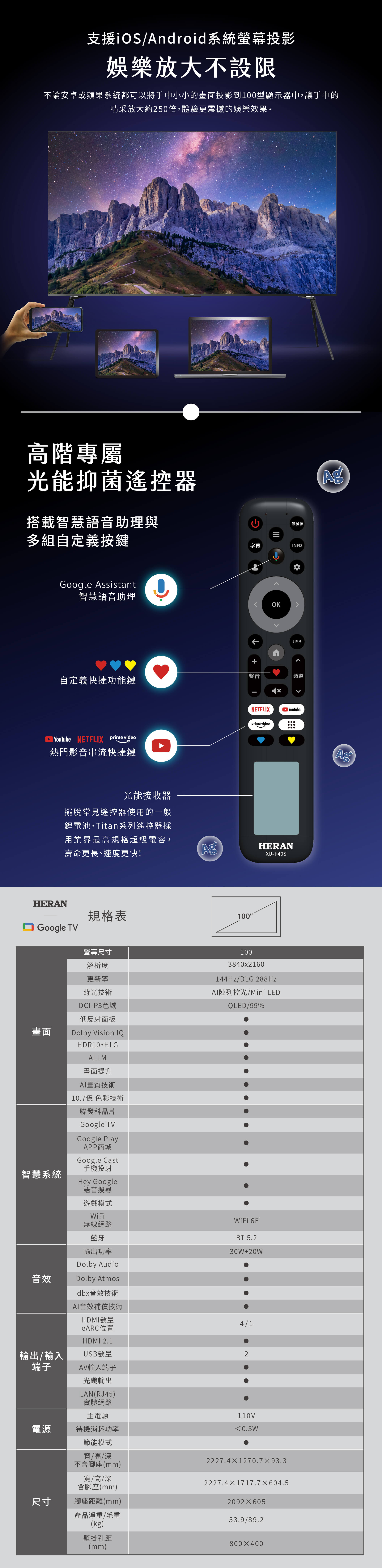 禾聯 100型 4K QD MiniLED Google TV 量子智慧連網液晶顯示器(HX-100TS750F)無視訊盒 (購買前請先來電聊聊)