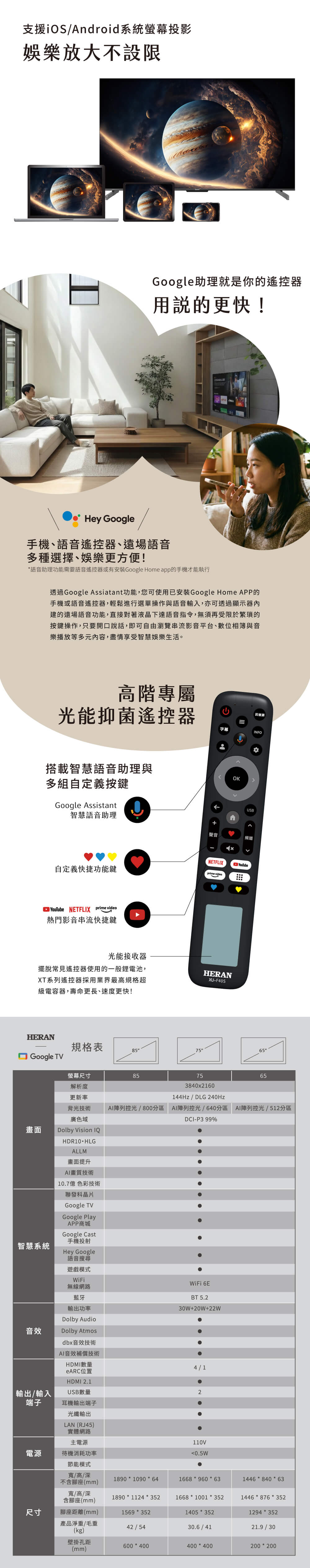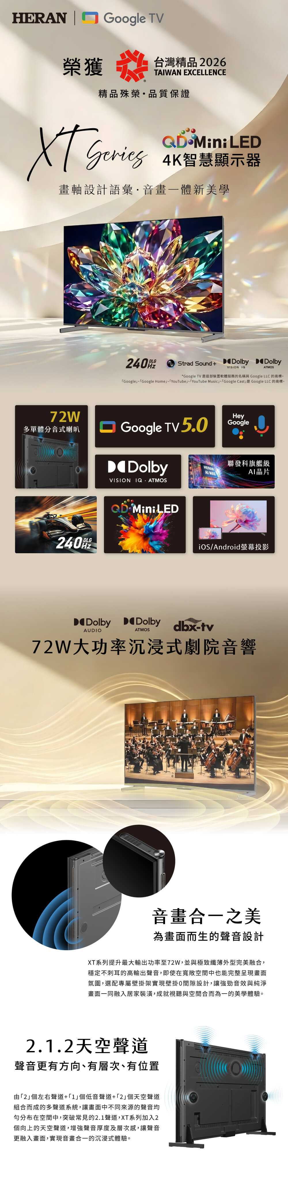 禾聯 75型 4K QD MiniLED Google TV 量子智慧連網液晶顯示器(HX-75XT770F)無視訊盒