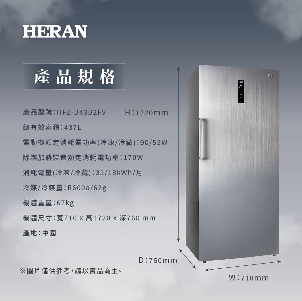 禾聯HFZ-B43B2FV變頻直立式冷凍櫃 437L