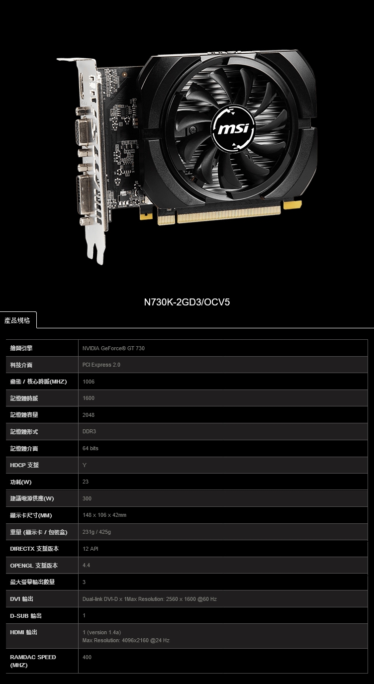 微星 N730K-2GD3/OCV5(1006MHz/2G DDR3/15cm/三年保)