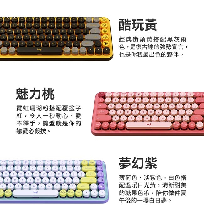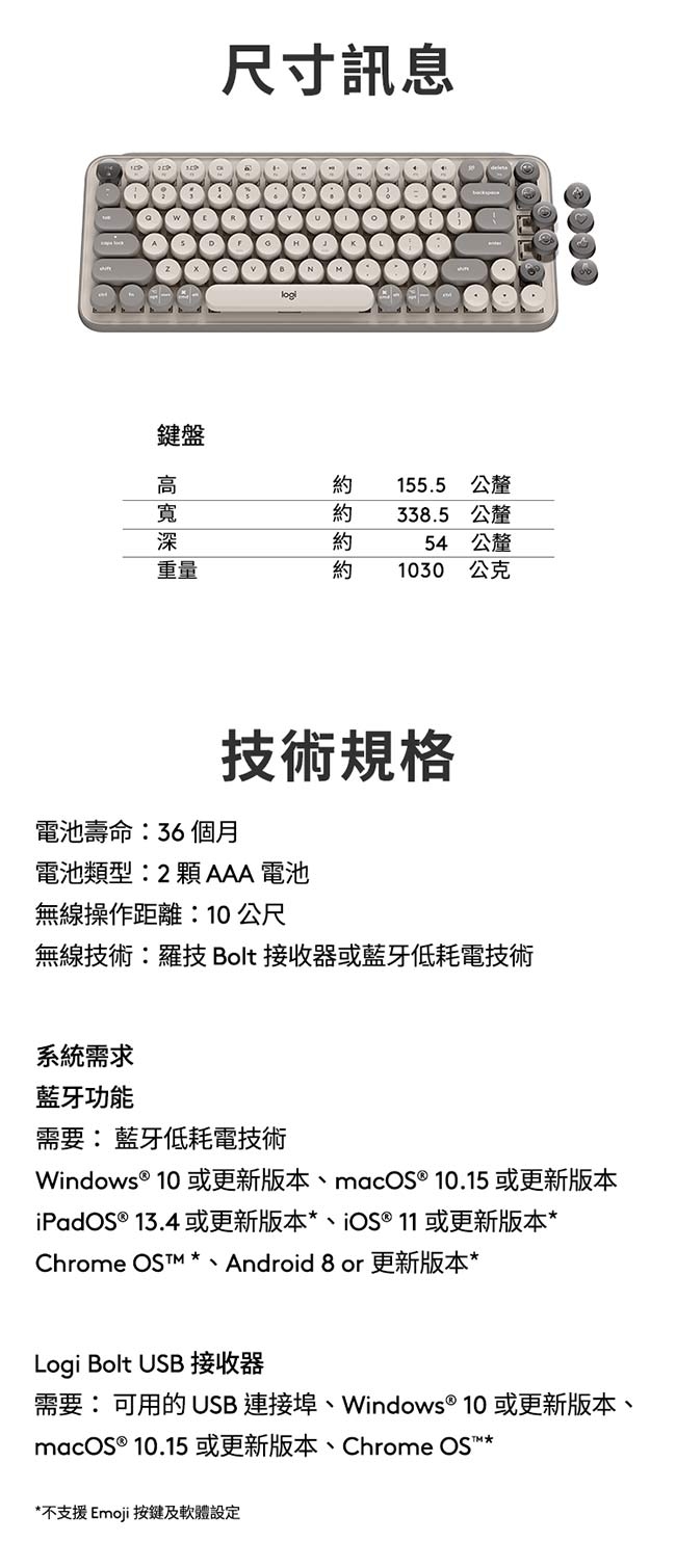 特色:自定義EMOJI表情包 特色:可一次連接3台設備,跨裝置切換 特色:復古懷舊重現傳統打字機敲鍵享受