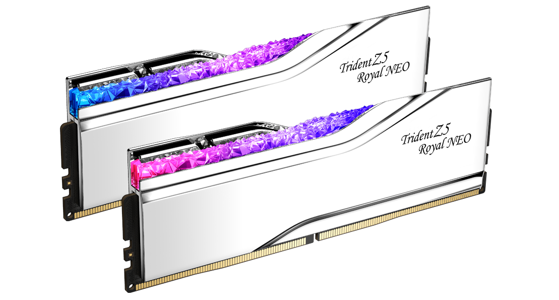 Trident Z5 Royal Neo 皇家戟EXPO 版DDR5 內存為芝奇專為AMD AM5 平台所打造的極速效能係列,並以極高標準時尚奢華工藝帶入硬件產品設計的旗艦力作,其散熱片經過精工細膩的電鍍處理,擁有如水鏡般清澈透亮的超高質感光澤,搭配如水鑽般晶亮璀璨的導光設計,採用高品質嚴選顆粒打造高效能模組,提供經典金銀雙色套裝選擇,象徵芝奇皇家戟系列對極限速度與極緻美學的永恆堅持。