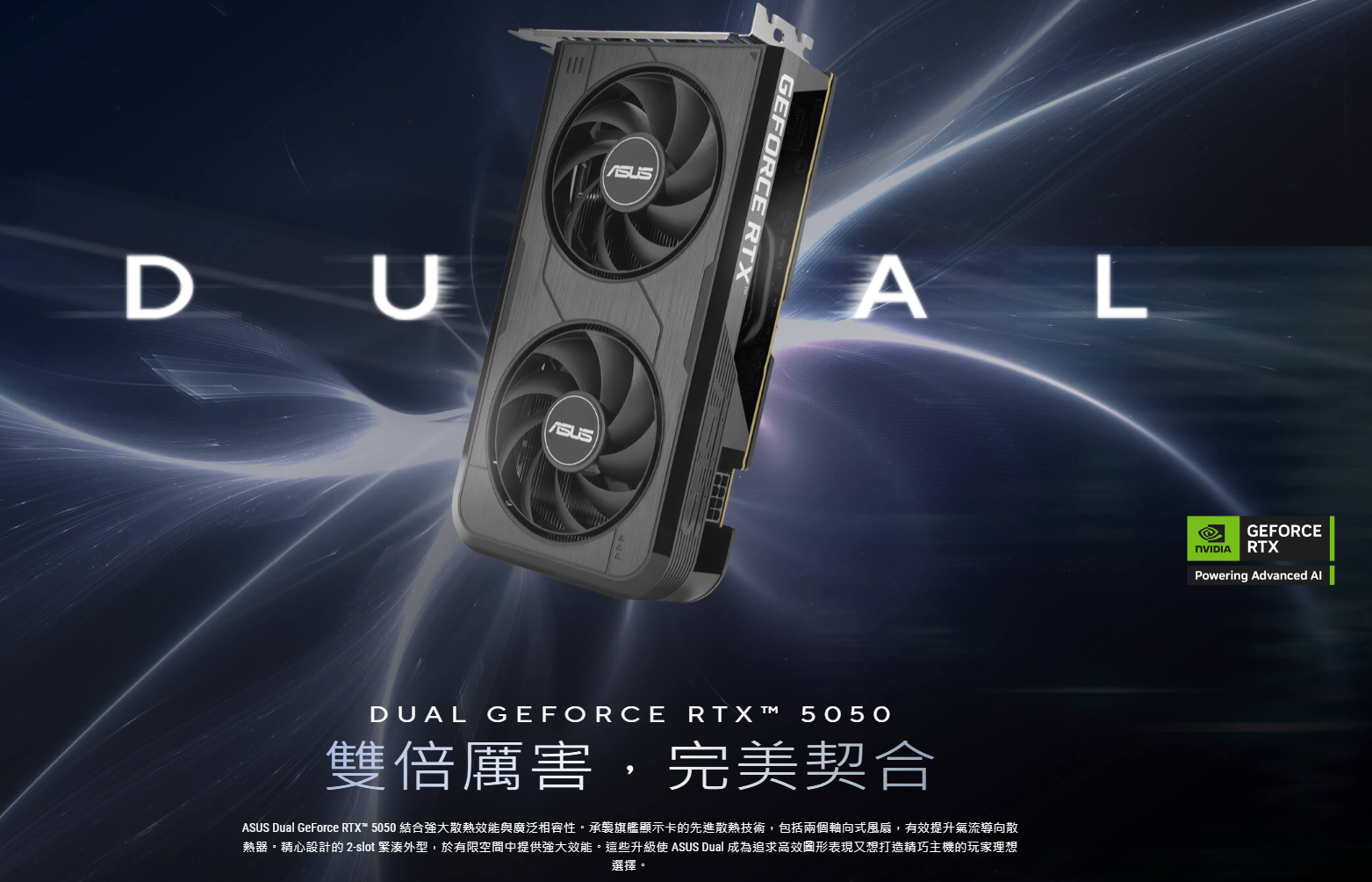 華碩 DUAL-RTX5050-O8G(2677MHz/21cm/雙風扇/註冊四年) 2-slot 設計
