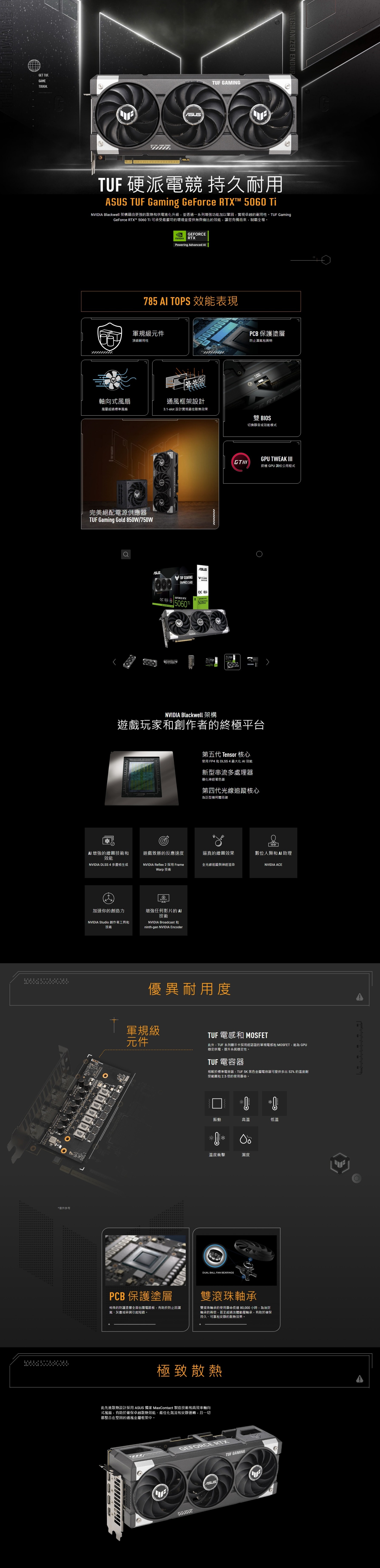 NVIDIA Blackwell 架構透過增強的冷卻和電力輸送得到提升,並透過堅固的加固實現了卓越的耐用性。使用 TUF Gaming GeForce RTX™ 5060 Ti 鎖定、加載並主宰,其設計旨在承受最惡劣的條件並提供無與倫比的性能。