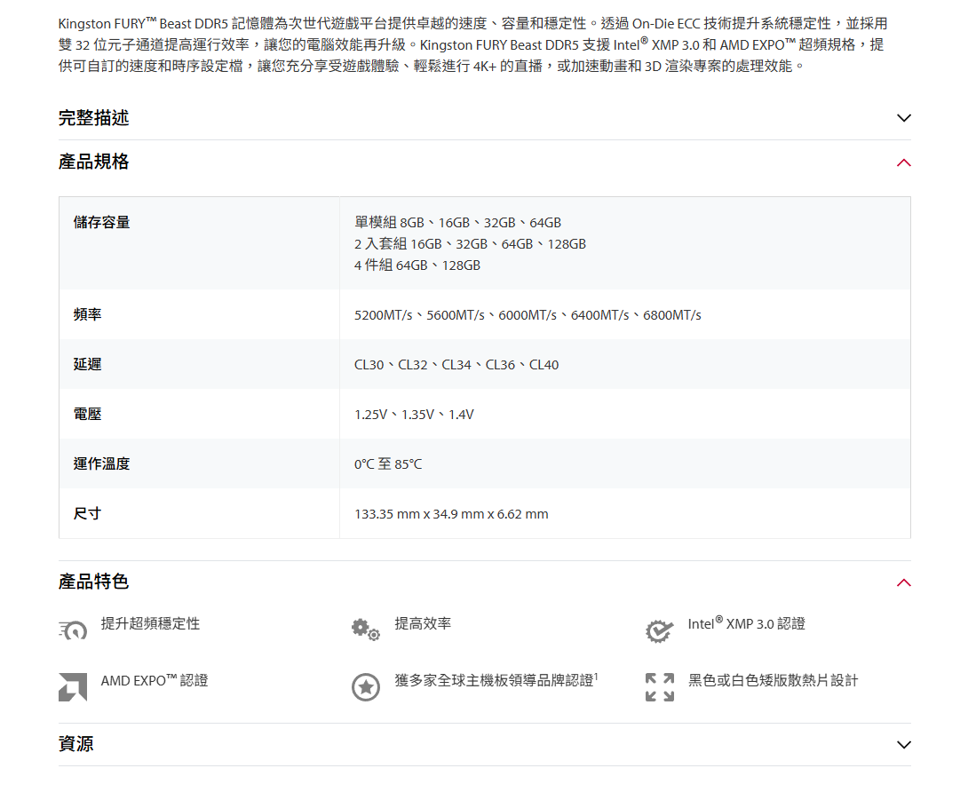 金士頓 單條8GB DDR5-5600(CL36) FURY Beast (獸獵者)