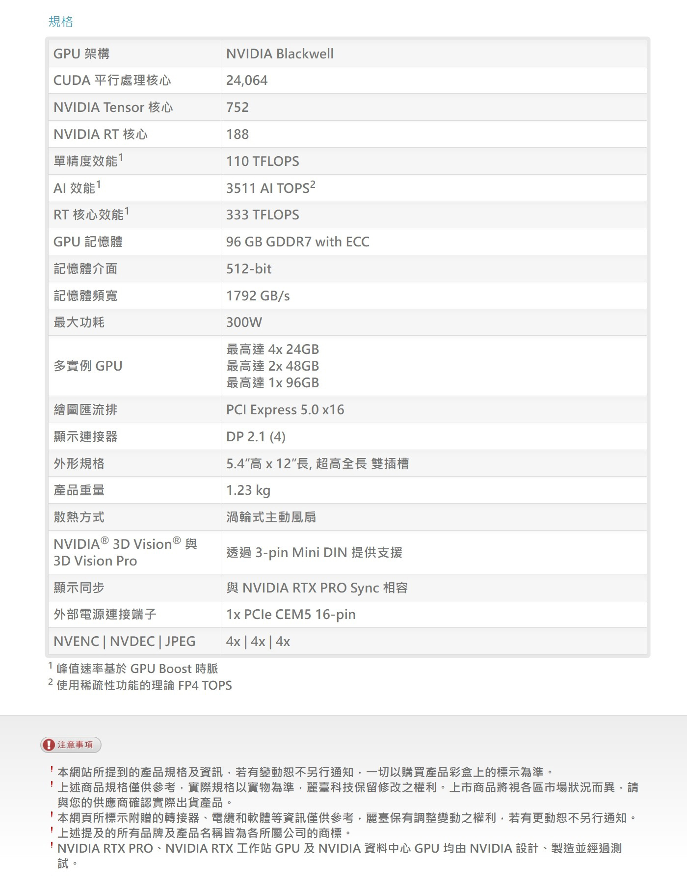商品規格 圖形加速卡插槽 PCIE 5.0 x16 圖形加速卡支援directX 12 圖形加速卡支援open GL Open GL 4.6 圖形加速卡支援nView多重顯示技術 nView 圖形加速卡最高解析度 7680 x 4320 @100 Hz 圖形加速卡輸出支援 4x DisplayPort 2.1b 圖形加速卡保固期限 3年 圖形加速卡記憶寬頻 192GB/s 圖形加速卡系統需求 1000 W Min. Power Supply 圖形加速卡附件 1x PCIe CEM5 16-pin 圖形加速卡介面 PCIE 5.0 x16 圖形加速卡記憶體 96 GDDR7 圖形加速卡記憶寬頻 1792 GB/s 圖形加速卡最高單精確度浮點效能 110 TFLOPS 圖形加速卡同時顯示螢幕輸出數 4 圖形加速卡最大功耗 300W 圖形加速卡CUDA 平行處理核心 24064 圖形加速卡建議電源供應 1000W 圖形加速卡CUDA 平行處理核心數 24064 圖形加速卡內存總線 512bit 圖形加速卡散熱方式 BLOWER 單風扇 圖形加速卡重量 1300g 圖形加速卡記憶體規格 GDDR7