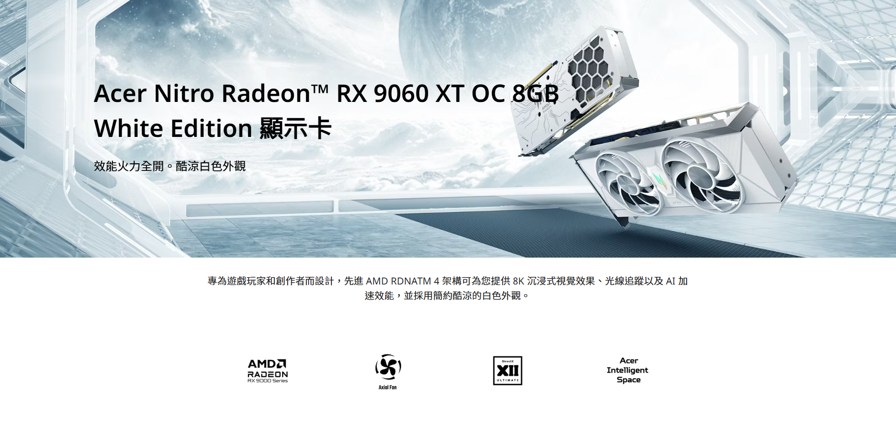 Acer Nitro RX9060XT 8GB OC White(3320MHz/27cm/雙風扇/三年保固/白)