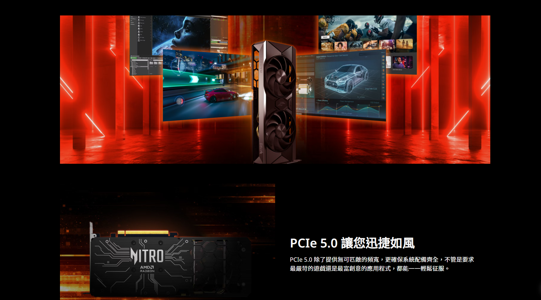 讓 Acer Nitro Radeon™ RX 9000 系列顯示卡激發您的熱情,令人驚艷的 8K 視覺效果絕對能點燃您內心的遊戲魂,而以 RDNA™ 4 架構為基礎的 AI 驅動工具,則能助您打造下一部巨作。