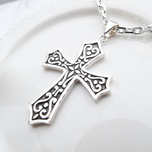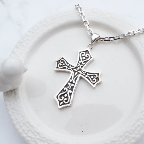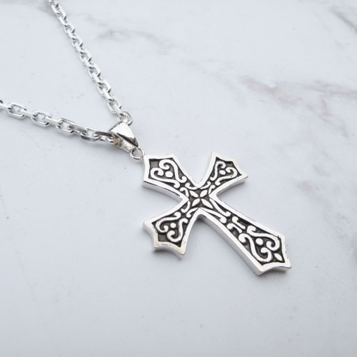 【手工客製銀飾】復古刻花十字架 |純銀項鍊(男女適戴)| 大員囡仔 - 項鍊 - 純銀 銀色