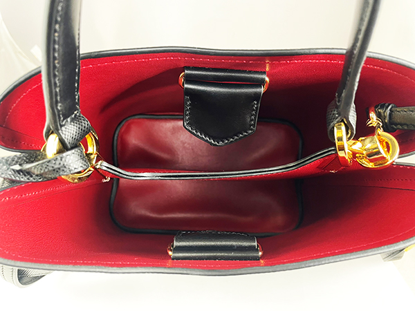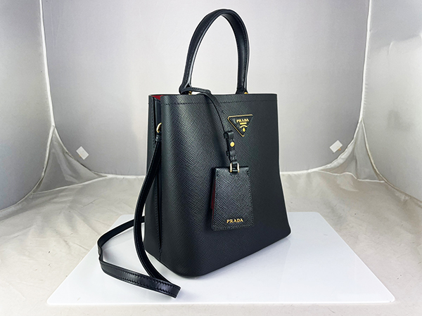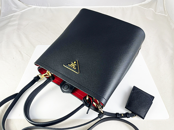 *奢華大道國際精品*【P201】PRADA 黑色/火紅色Panier Saffiano防刮牛皮手提/斜背兩用包 1BA2
