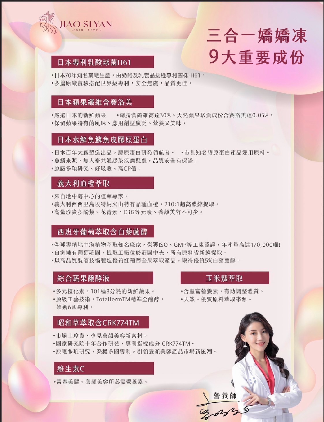 一條果凍抵多瓶,打造最符合亞洲人的保健食品,豐富膠原、促進腸胃消化幫助體內排水完美比例,重本重量,添加生技廠合作,研究院十年研發的專利昭和草萃取crk774,是市售少見、以及多樣化成份促進膠原蛋白合成,達到完美比例的效果。
