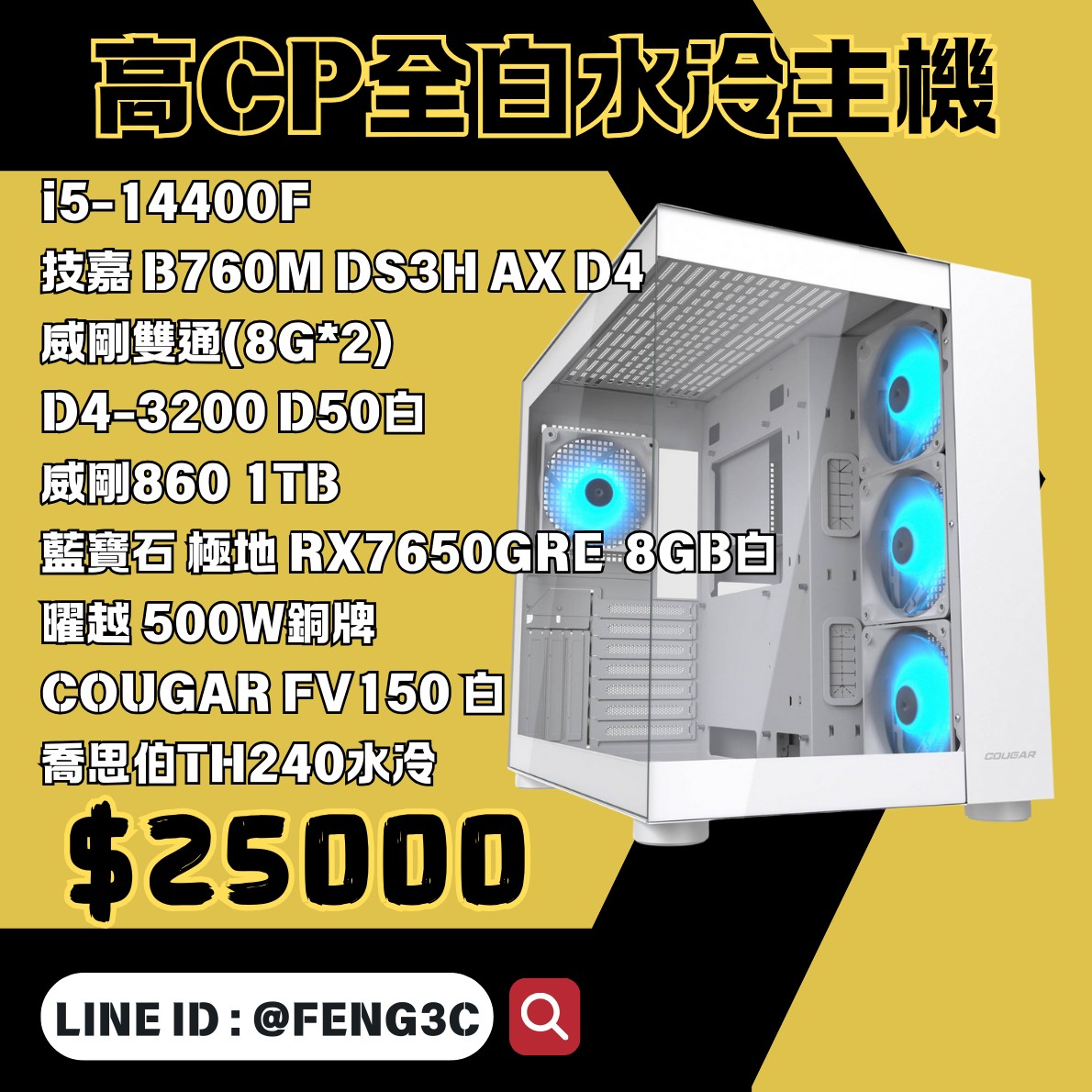 『高CP全白水冷主機』Intel平台(i5-14400F/B760/16GDDR4/1TB SSD/RX7650/500W)