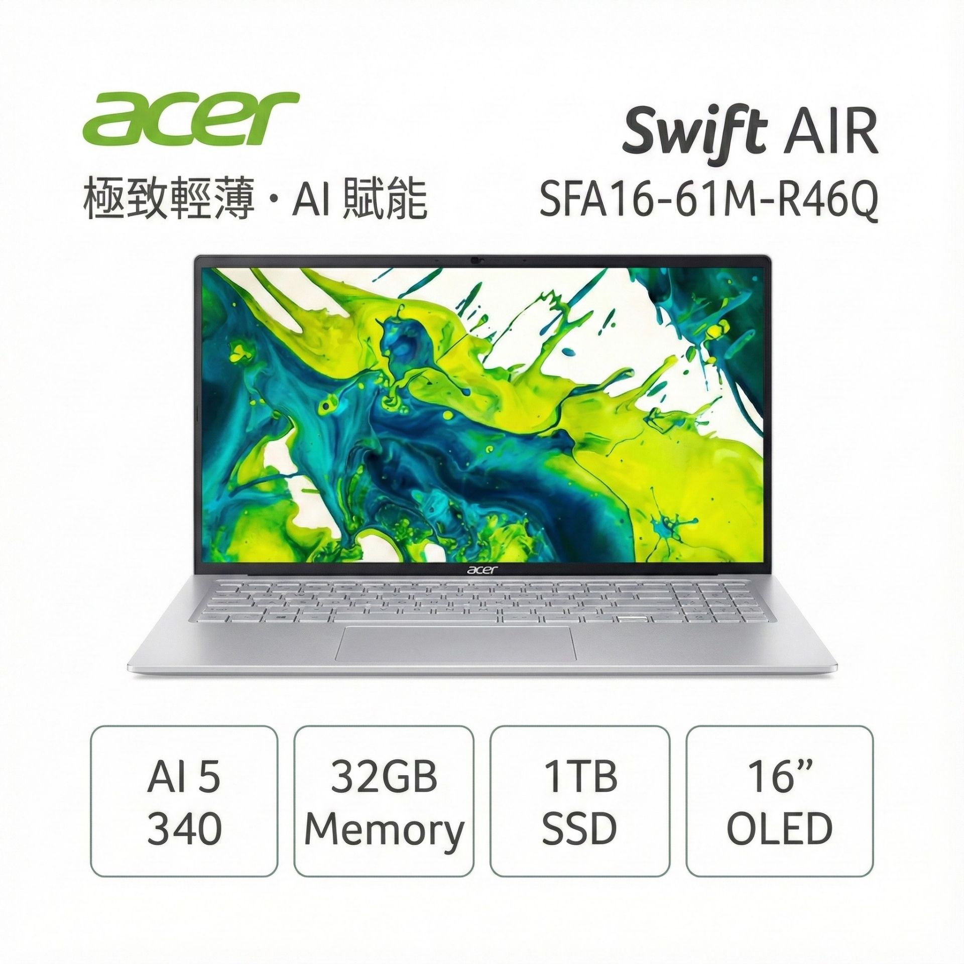 ACER 宏碁Swift AIR SFA16-61M-R46Q 16吋 AI筆電 銀(AI 5 340/32G/1TB SSD/OLED/W11)🎈送保護套/滑鼠墊/鍵盤膜🎈
