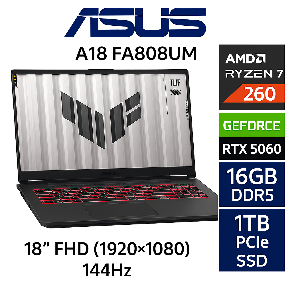 NVIDIA® GeForce RTX™ 5060 8GB GDDR7 (具備MUX獨顯直連) AMD Ryzen™ 7 260 Processor 3.8GHz 18-inch / FHD+ 16:10 (1920 x 1200, WUXGA) / 144Hz