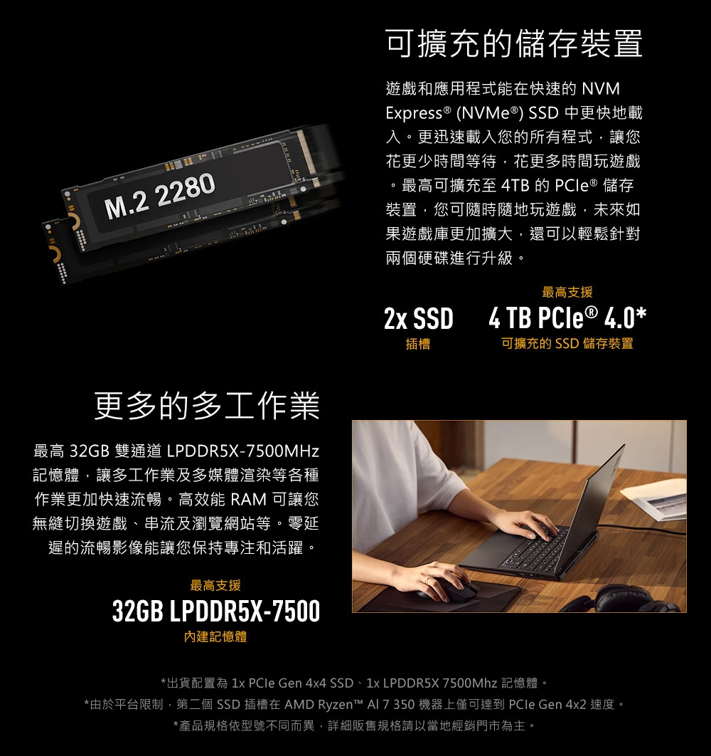 SSD硬碟:1TB PCIe® 4.0 NVMe™ M.2 SSD / 共2個插槽,已使用1個
