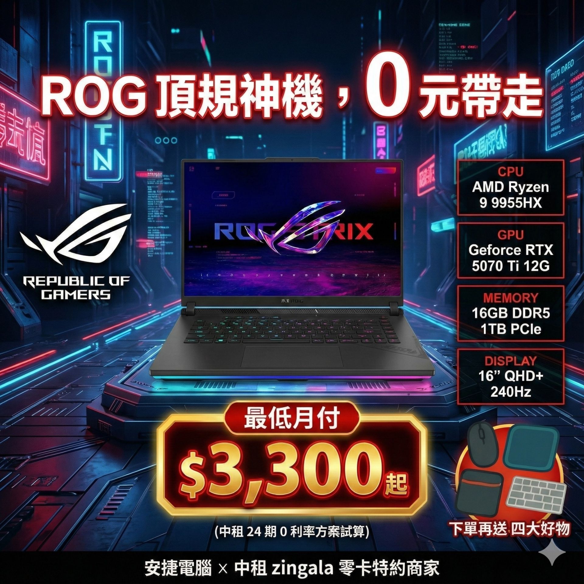 ASUS ROG 華碩Strix G16 16吋電競筆電黑(R9-9955HX/16GB/1TB/GeForce RTX 5070 Ti-12G/G614FR-0054G9955HX-NBL)🎈送保護套/滑鼠墊/鍵盤膜🎈