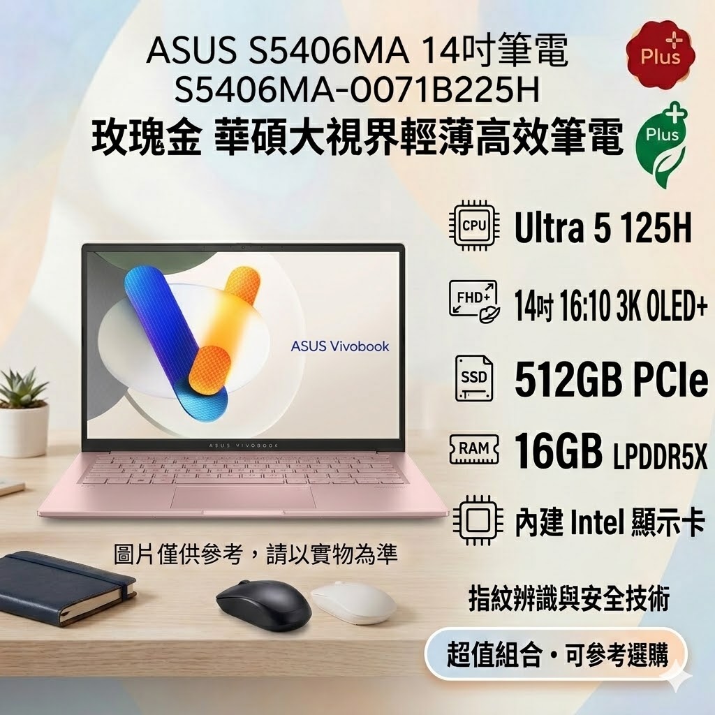 ASUS S5406MA 14吋筆電 Ultra 5 125H/16GB/512G/EVO/玫瑰金/Vivobook S14 OLED🎈送保護套/滑鼠墊/鍵盤膜🎈