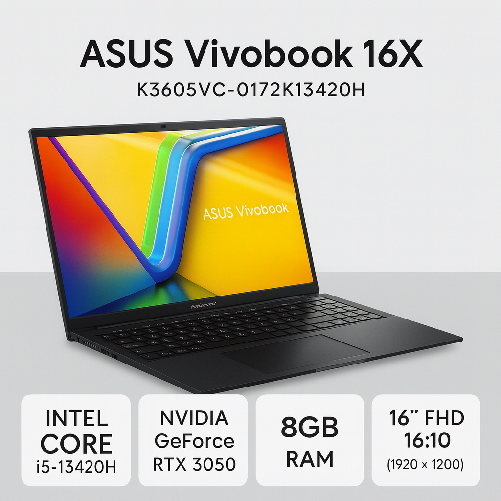 ASUS VivoBook 16X K3605VC-0172K13420H 搖滾黑 華碩13代大視界效能筆電/i5-13420H/RTX3050 4G/8GB/512GB PCIe/16吋 16:10 FHD+ 144Hz/W11🎈送保護套/滑鼠墊/鍵盤膜🎈