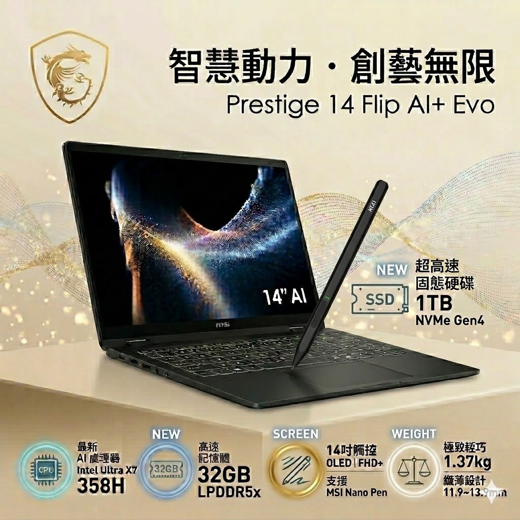 MSI 微星Prestige 14 Flip AI+ 14吋AI輕薄筆電黑色(Intel Ultra X7 358H/32GB/1TB/WIN11P/D3MTG-033TW)🎈送保護套/滑鼠墊/鍵盤膜🎈