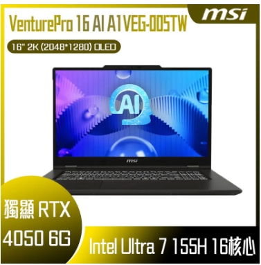 MSI 微星VenturePro 16 AI 16吋 AI筆電黑色(Ultra 7 155H/16GB/512GB/RTX4050-6G/WIN11/A1VEG-005TW)🎈送保護套/滑鼠墊/鍵盤膜🎈