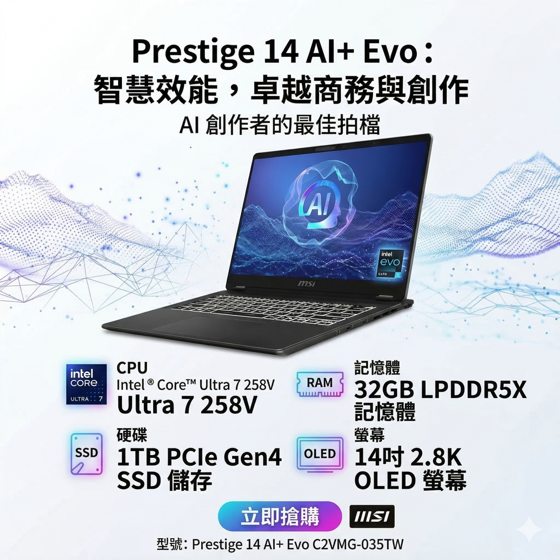 MSI Prestige 14 AI+ Evo C2VMG-035TW 微星輕薄效能創作者AI筆電/Ultra 7-258V/32GB LPDDR5X/1TB PCIe/14吋 16:10 2.8K OLED/W11 Pro/白色背光鍵盤🎈送保護套/滑鼠墊/鍵盤膜🎈